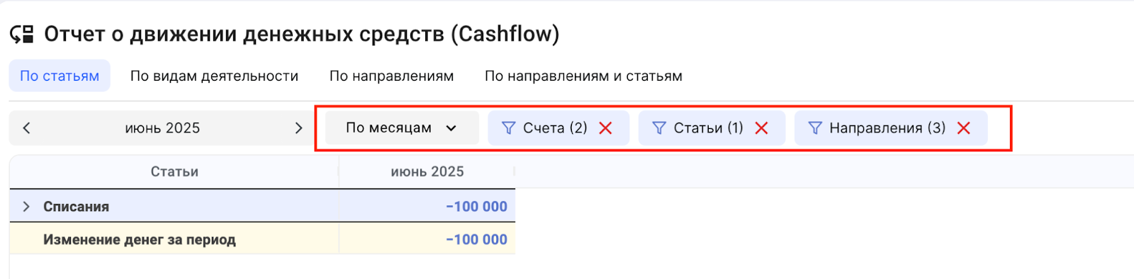 Фильтры по счетам , статьям и направлениям , которые могут работать одновременно.