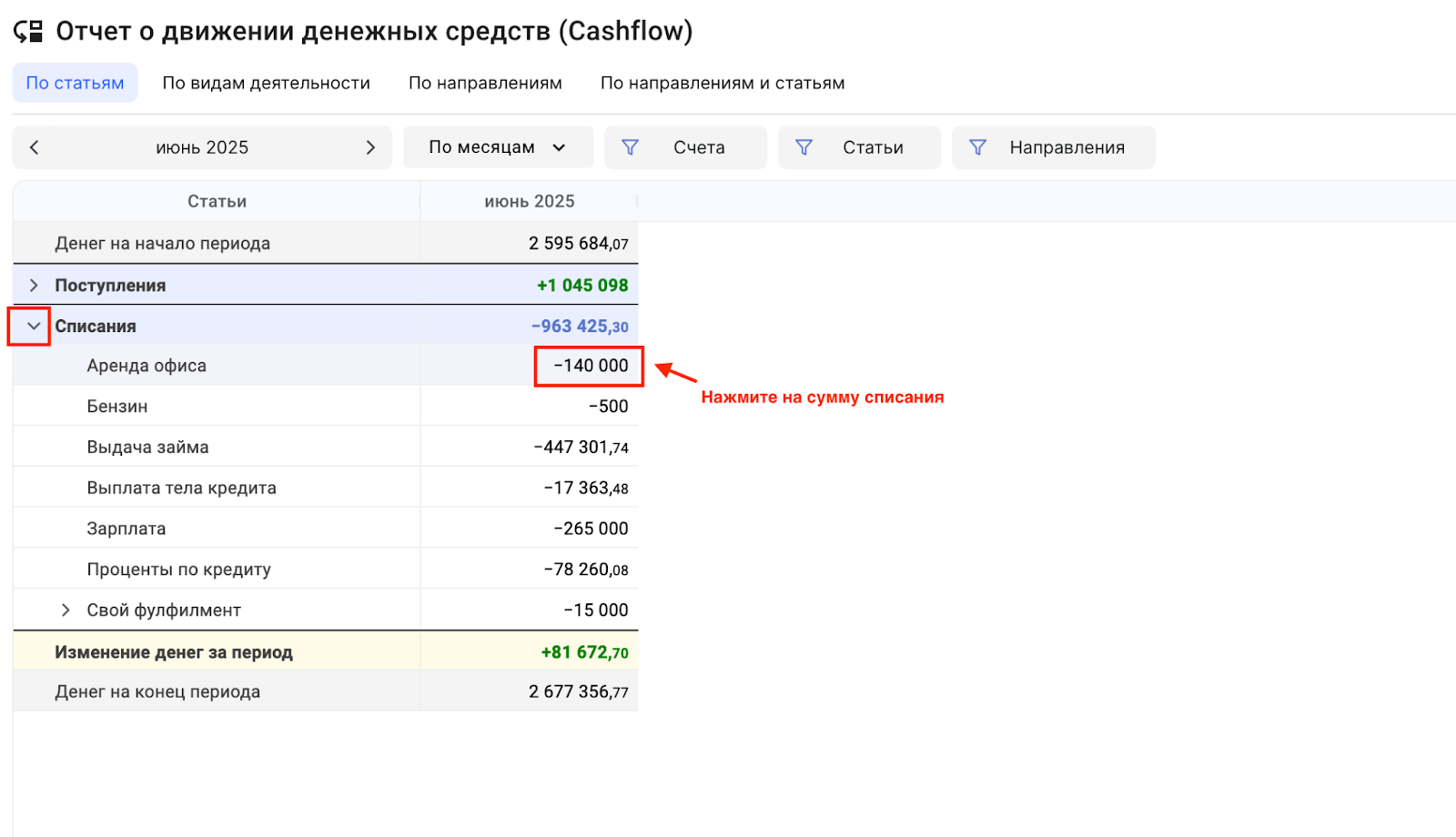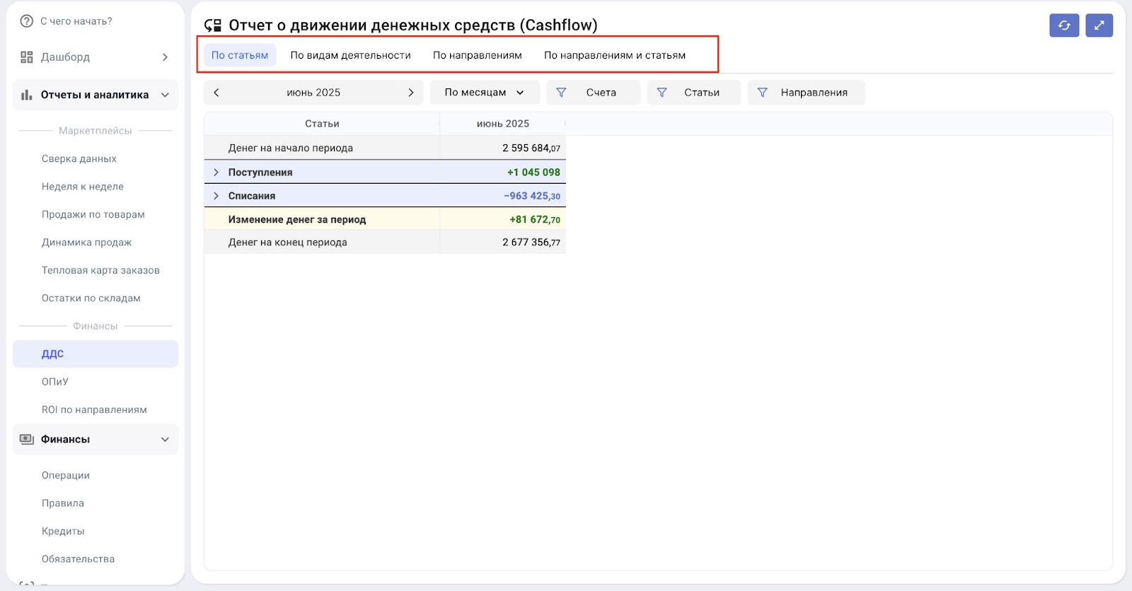 3. Упрощенный контроль финансов. Четкая структура с разбивкой по категориям (например, выручка, займы, аренда, зарплата). Видно категорию Без статьи — помогает отслеживать неразнесенные операции.