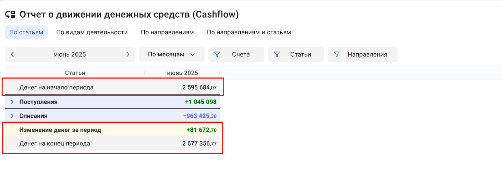 Остаток на начало периода, Изменение денег за период (на сколько денег стало больше или меньше) и Остаток на конец периода