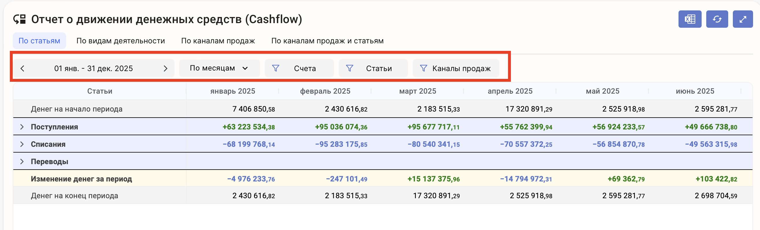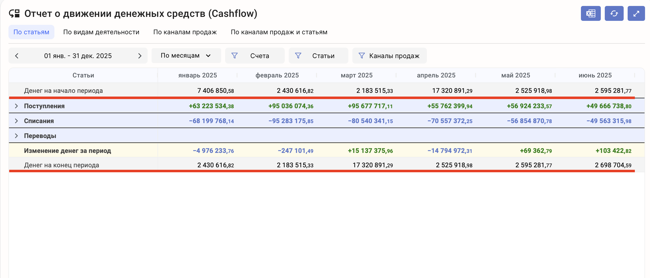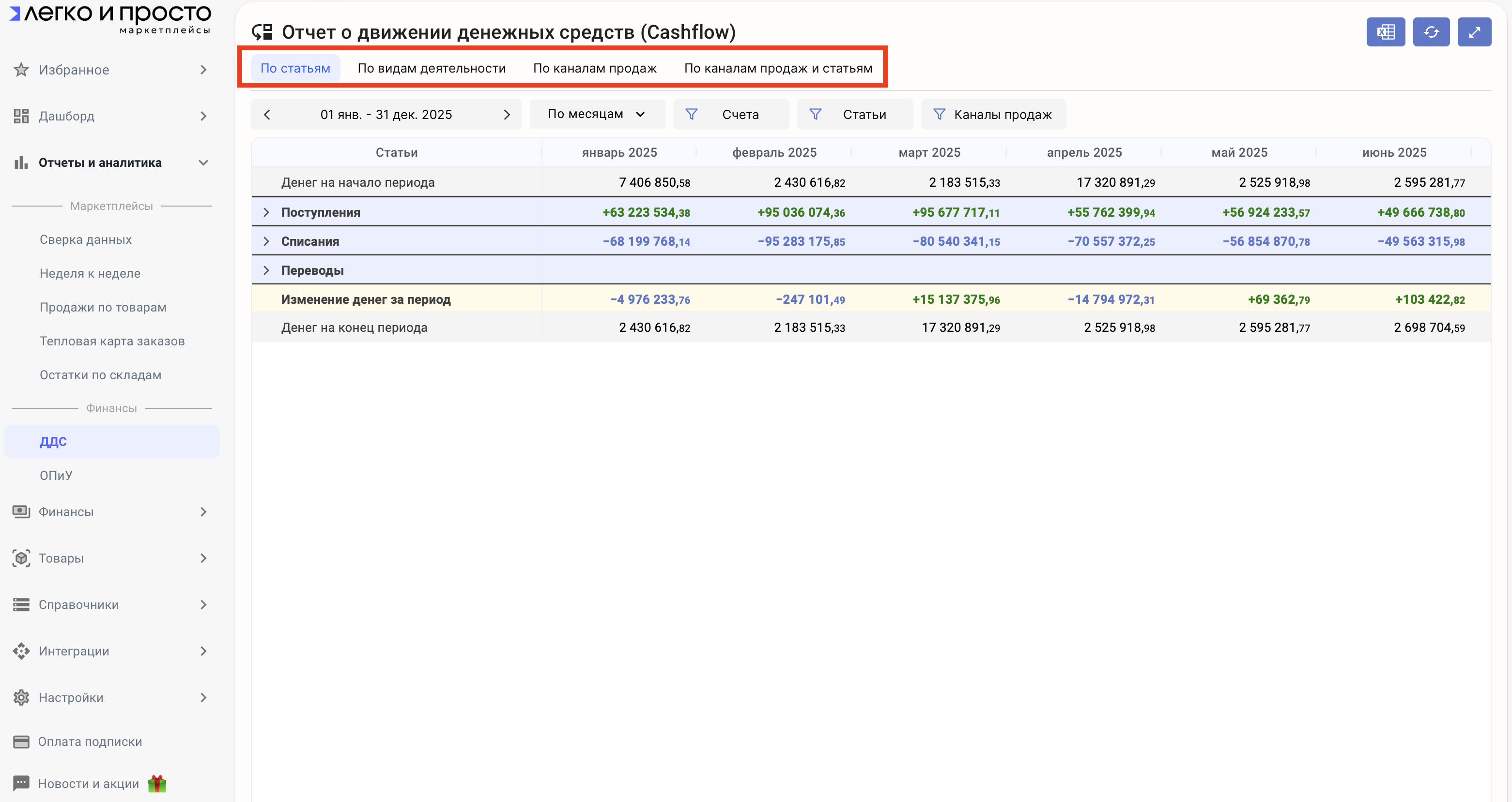 Для удобства в отчёте ДДС в сервисе есть специальная индикация для статей, которые не участвуют в расчёте прибыли (соответственно, не попадают в ОПиУ)