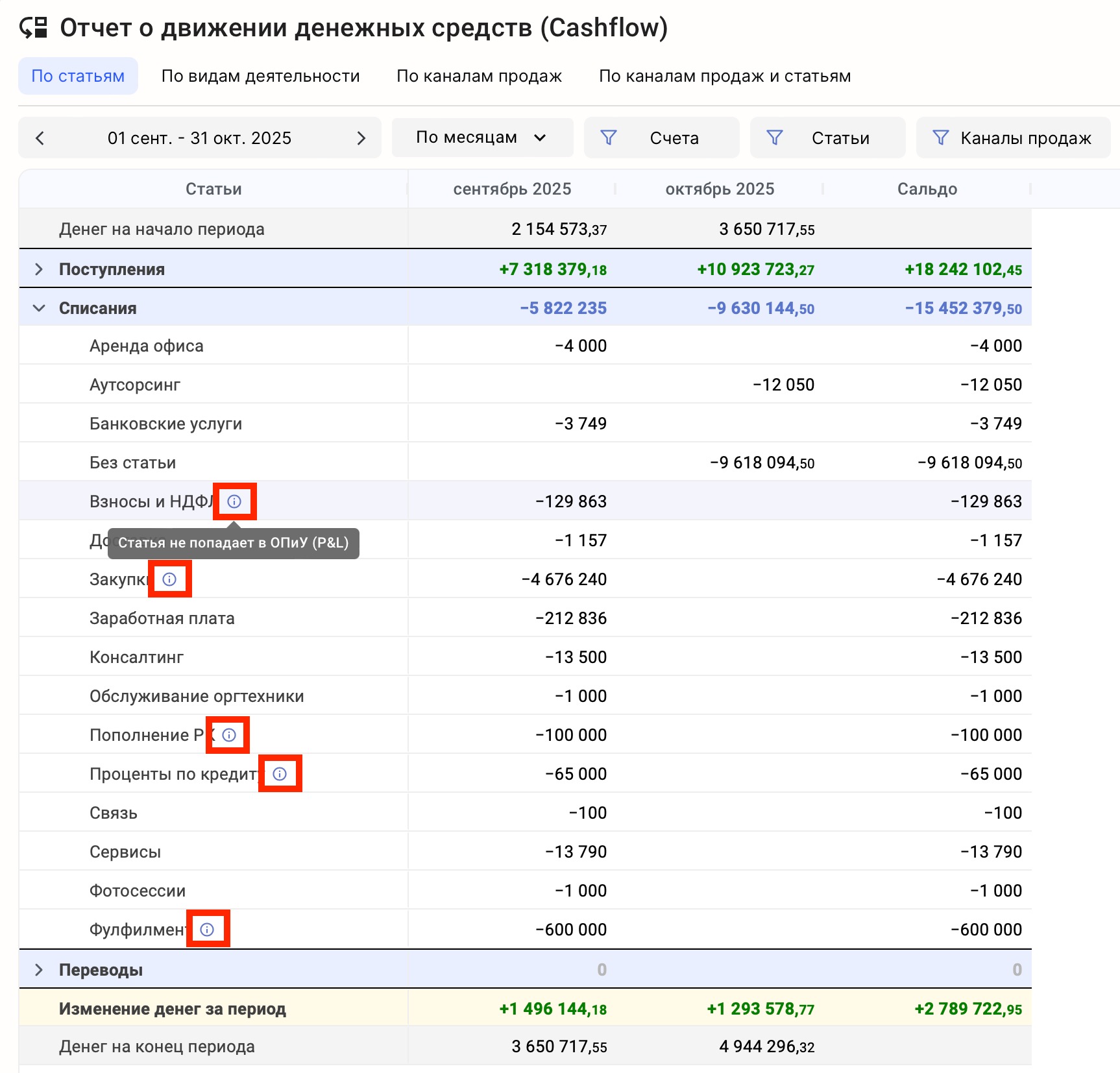 Значок ℹ️ рядом со статьёй означает, что данная операция не попадает в отчёт о прибылях и убытках (ОПиУ).