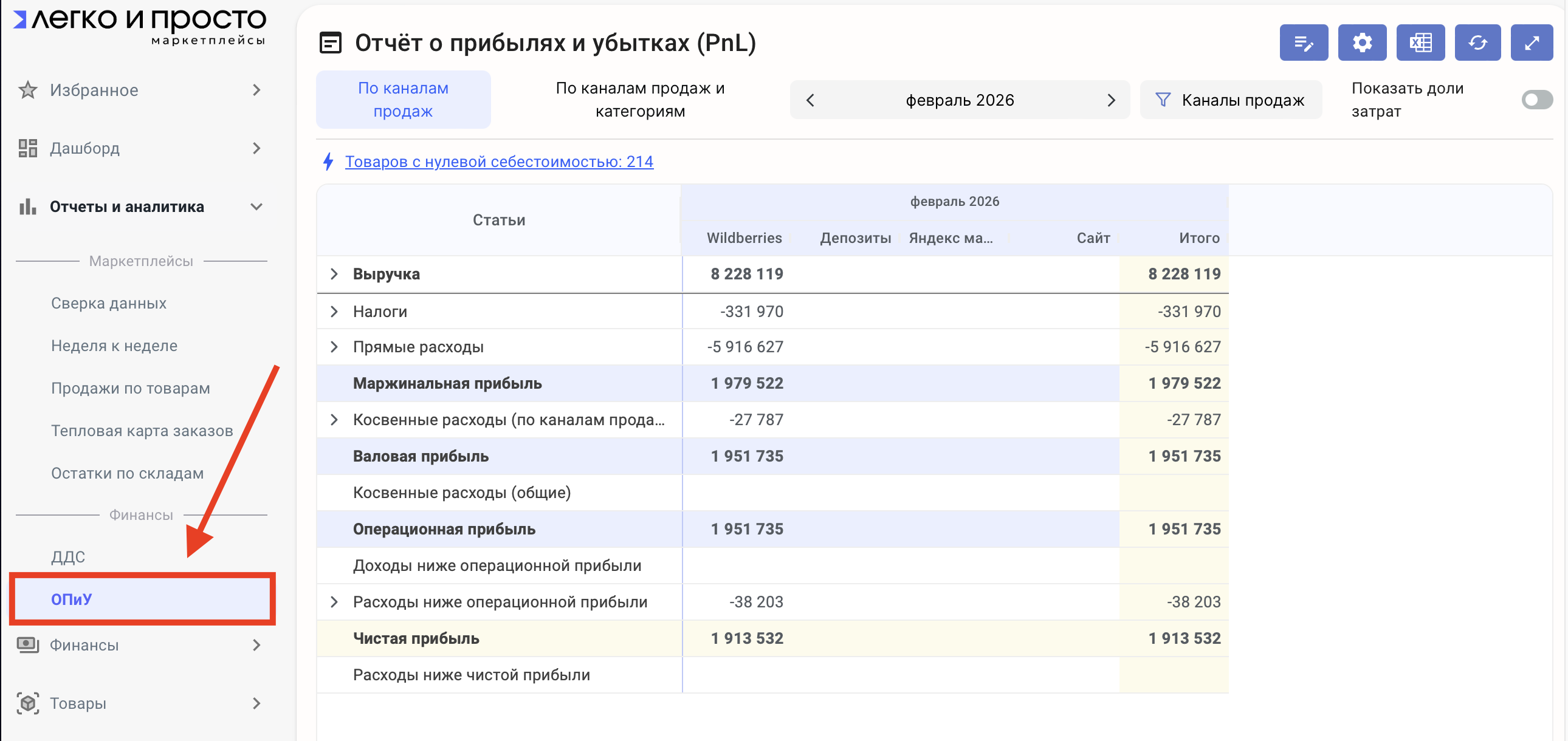 Отчет ОПиУ находится в меню Отчеты и аналитика, блок Финансы.
