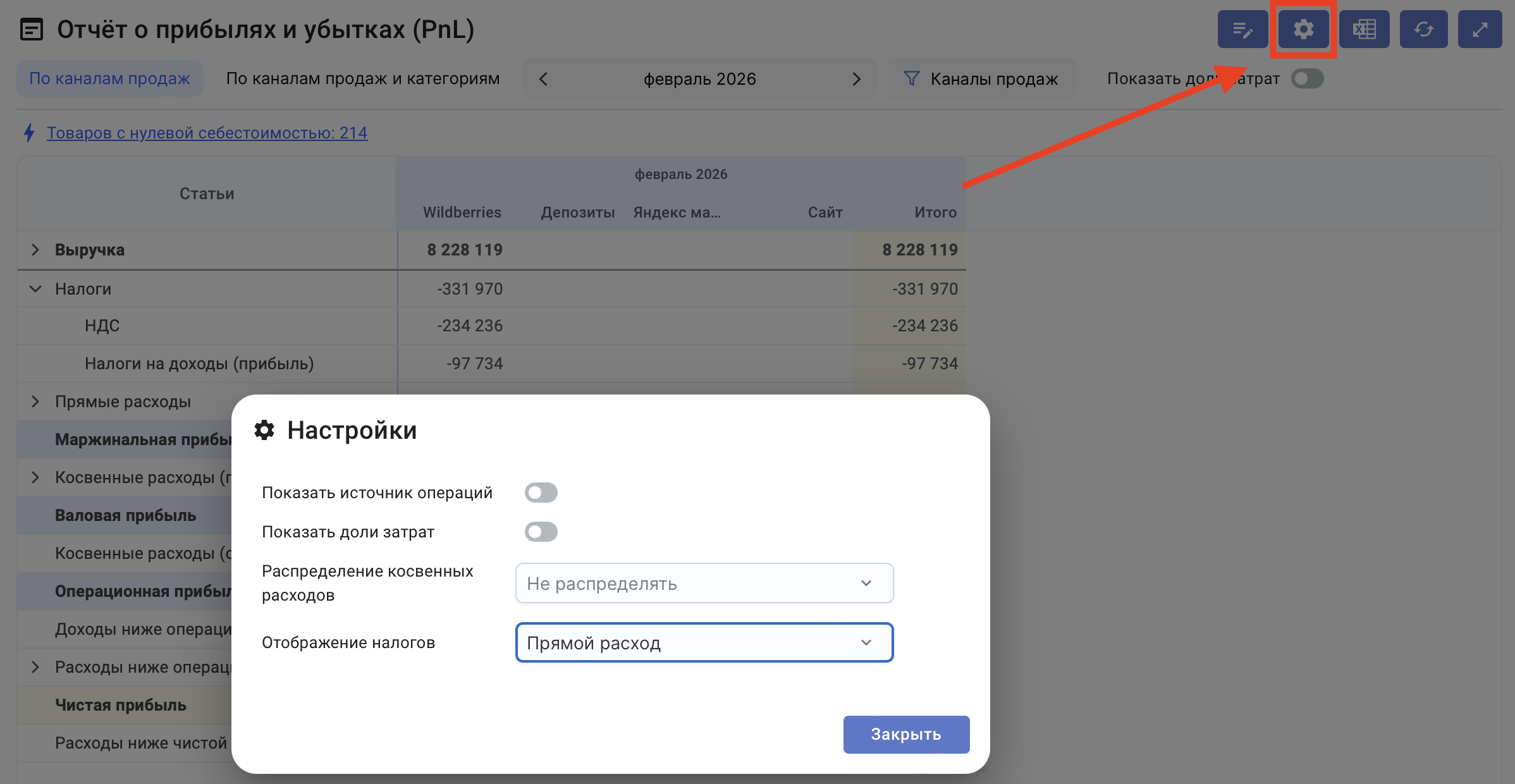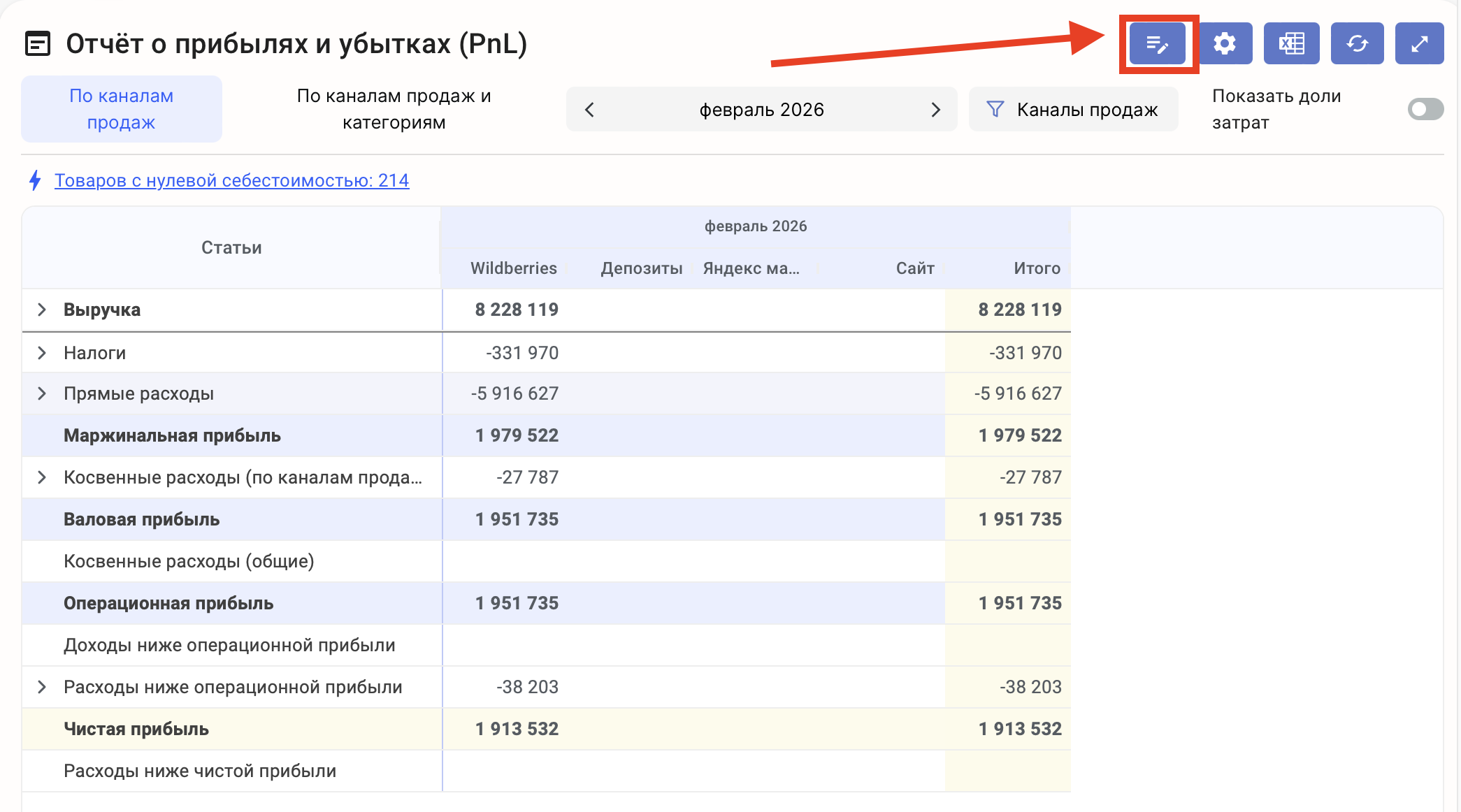 Показать доли затрат - отображает долю каждой статьи затрат в процентах от выручки. Включите эту функцию, чтобы лучше понимать структуру и распределение расходов.