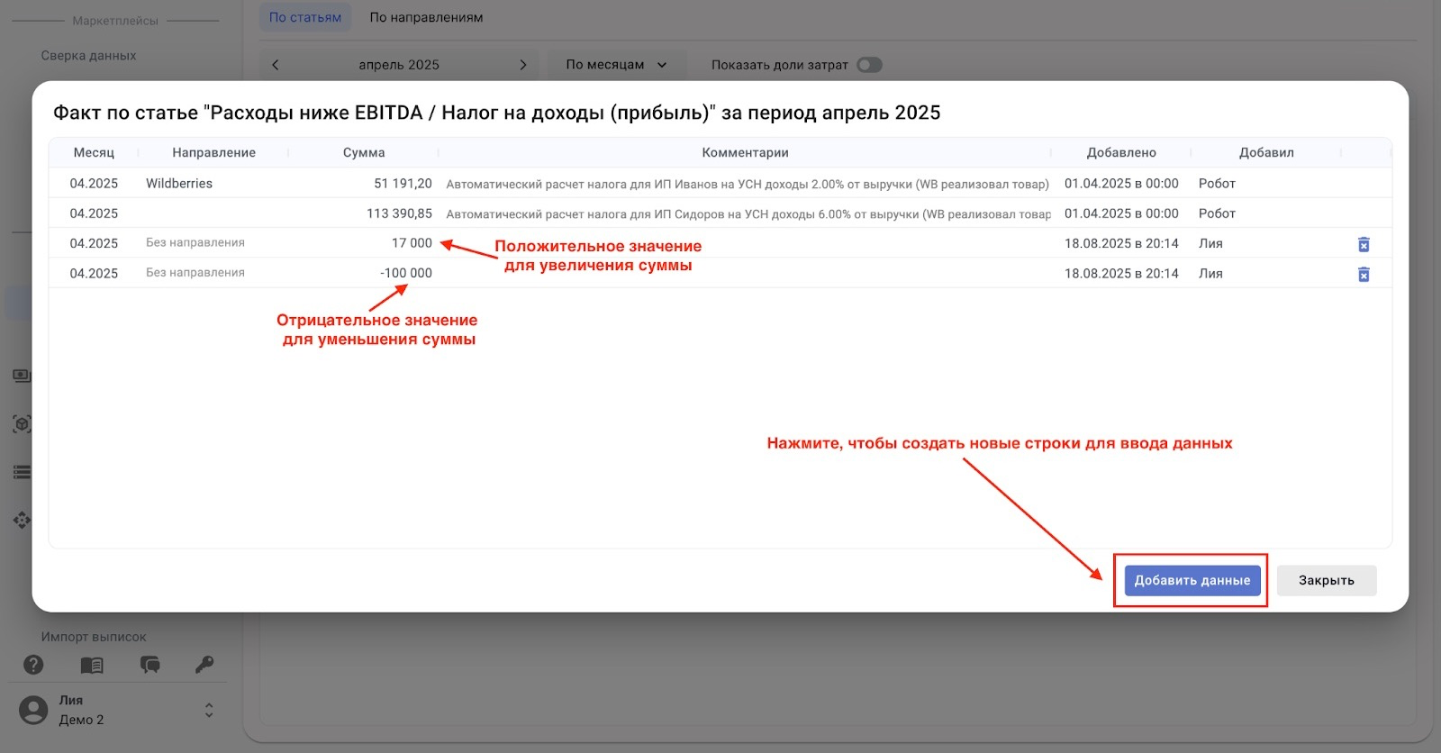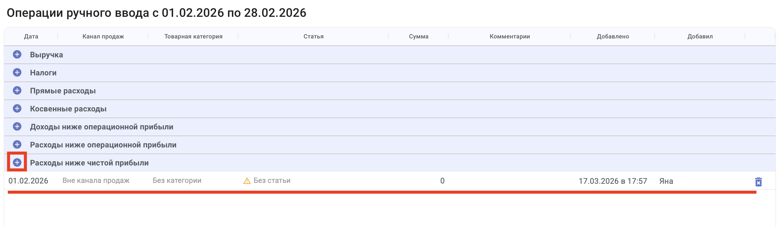 Вы можете вручную добавить собственные статьи в структуру отчета и вручную вносить финансовые результаты из внешних систем. Например из отчетов маркетплейсов, которые не интегрированы в сервис "Легко и просто" или из внутренних таблиц компании.
