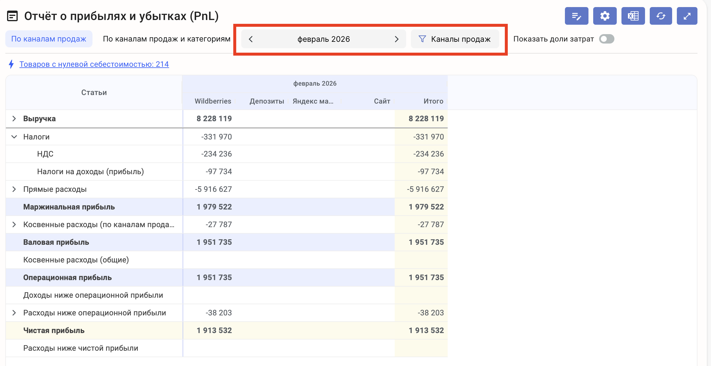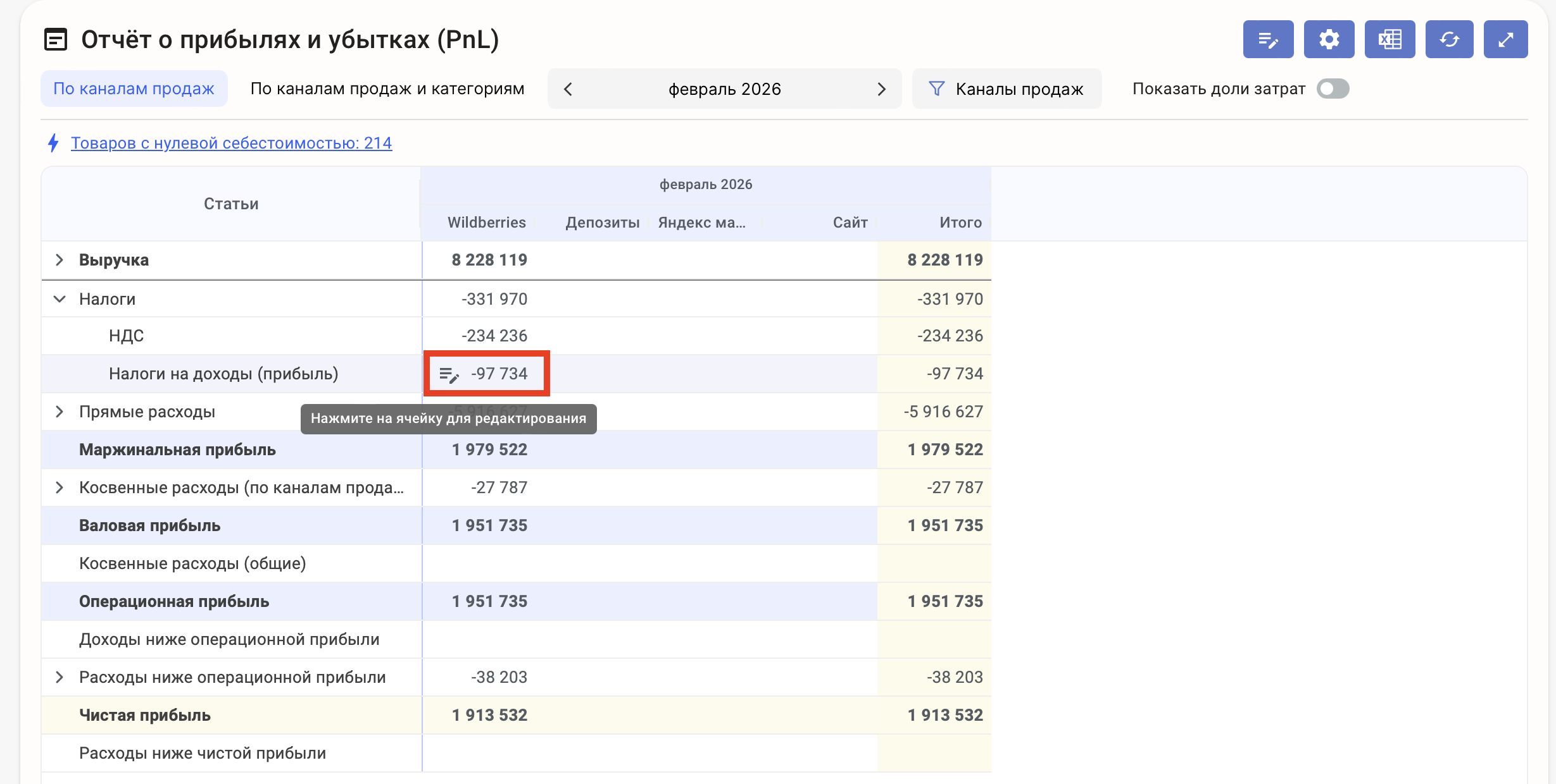 Данные о выручке и расходах на маркетплейсах автоматически подтягиваются в отчет из интеграций с маркетплейсами.