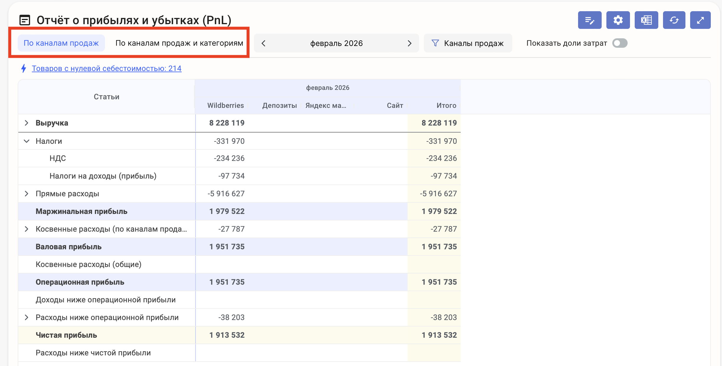 Отслеживайте изменения ключевых показателей и сравнивайте каналы продаж по маржинальности и валовой прибыли. Отчет можно отобразить в режимах "По каналам продаж" и "По каналам продаж и категориям".