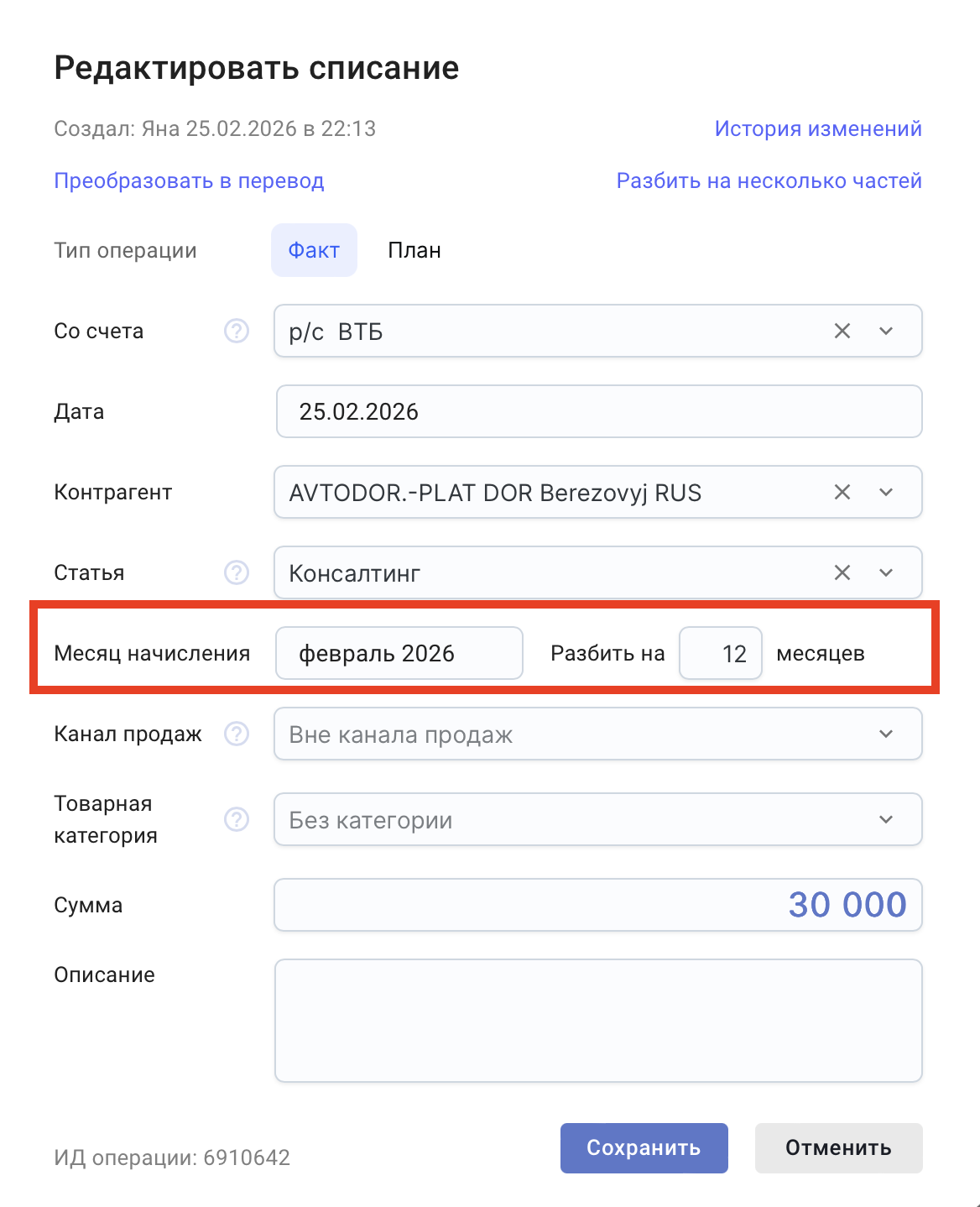 Вы можете изменить месяц начисления денежных операций, чтобы отобразить их в нужном периоде, а также разделять расход на нужное количество месяцев для ОПиУ.