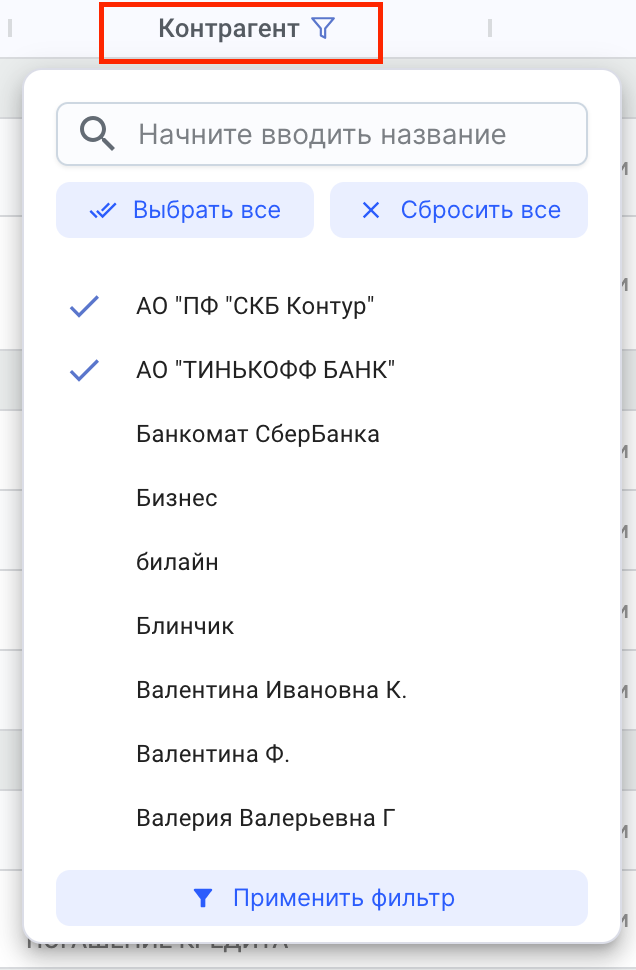 Выберите один или несколько счетов, чтобы отобразить только операции, связанные с выбранными счетами.