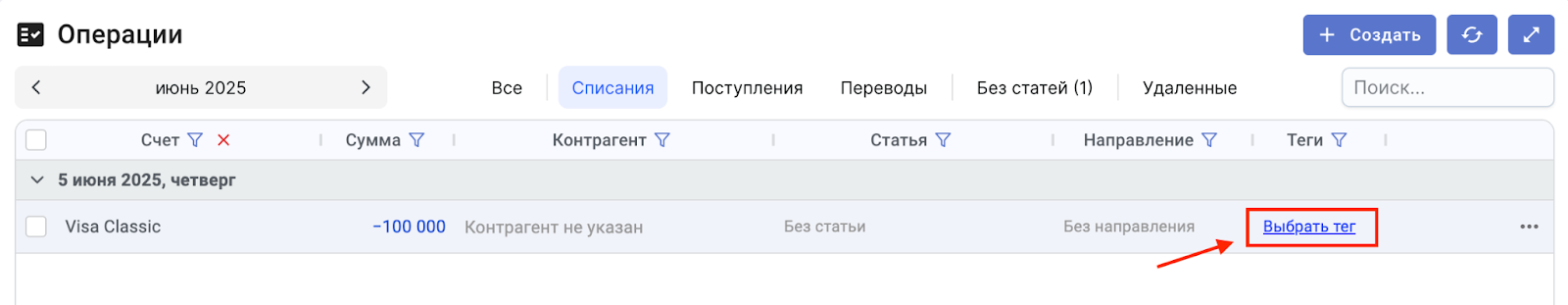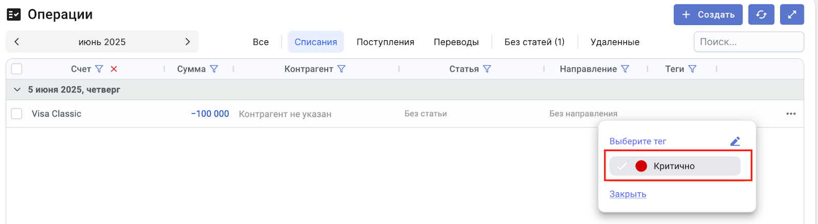 Если вы ведете проект, где есть критичные платежи, можно пометить их тегом «Критично», чтобы в будущем легко отфильтровать такие операции.