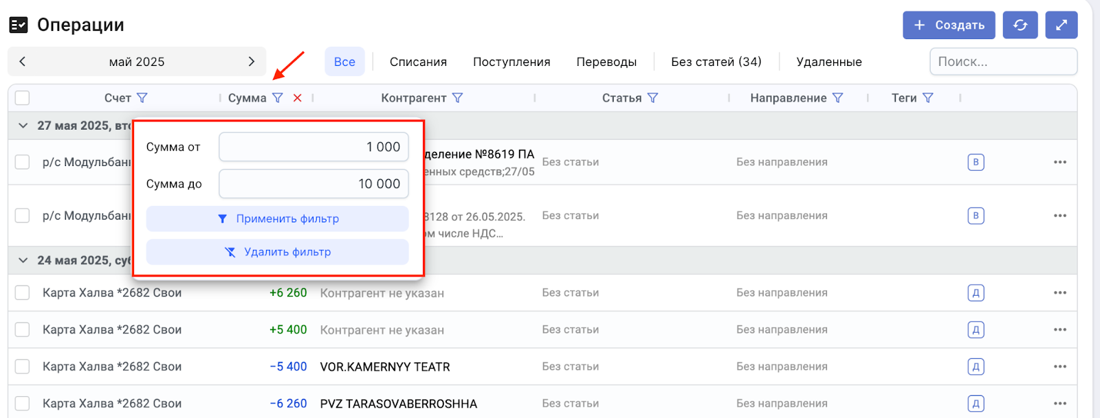 Укажите сумму «От» и «До» — сервис отобразит операции, попадающие в заданный диапазон.