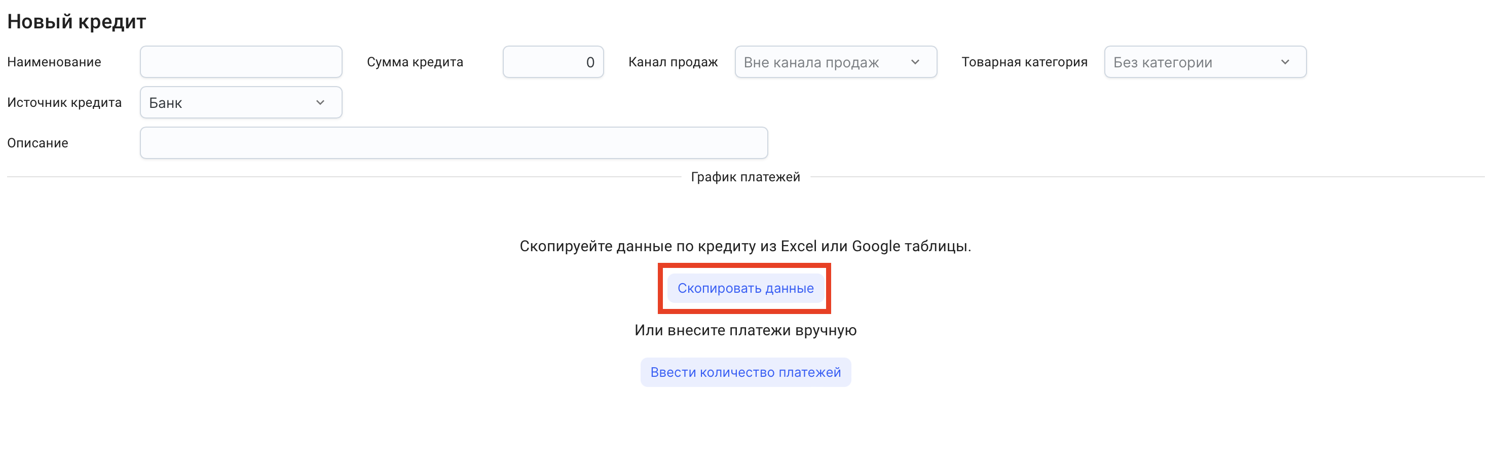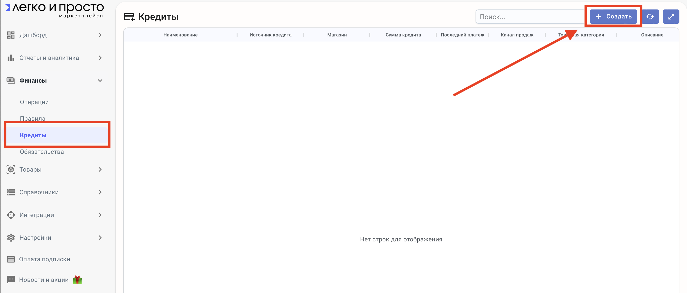 Перейдите в раздел Финансы-Кредиты и нажмите "Создать".