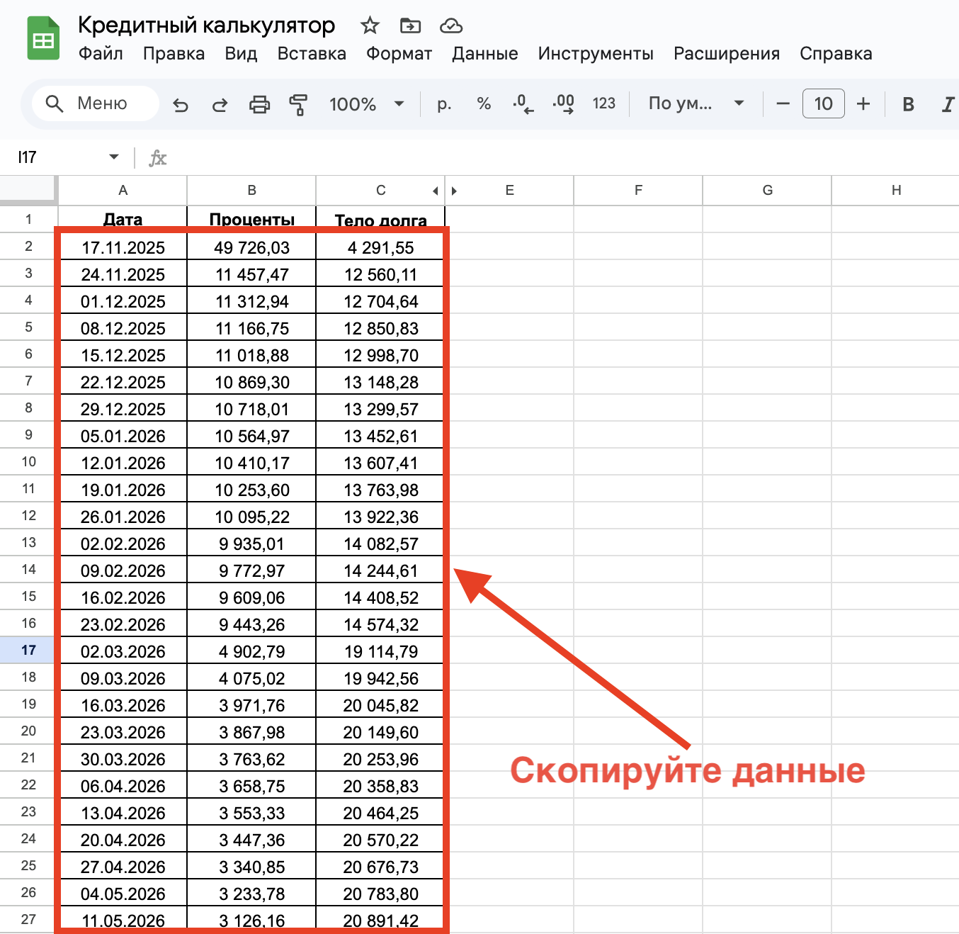 Продолжайте, пока итоговый остаток по кредиту не станет нулевым