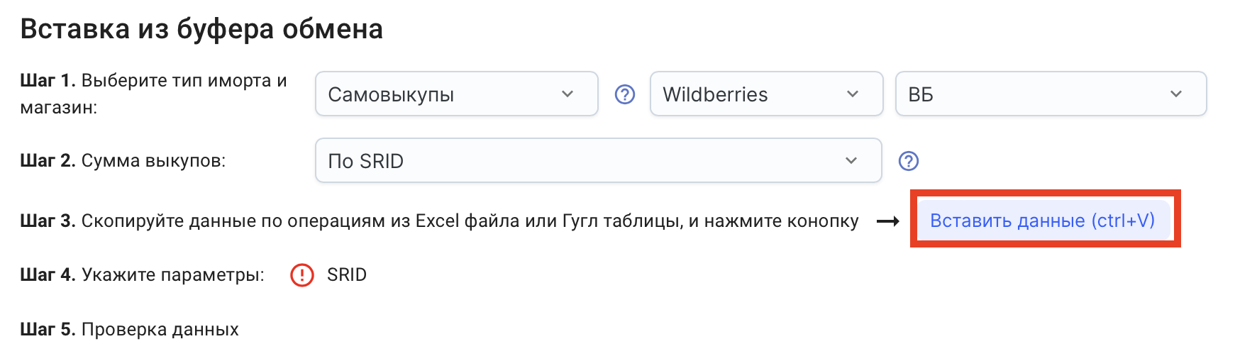 - По SRID (ВБ) - сумма и дата выкупа будет рассчитана атоматически из заказов, найденных по SRID. Максимально точный вариант при расчете маржинальной прибыли. Для магазинов Ozon этот способ называется "По ИД заказа".