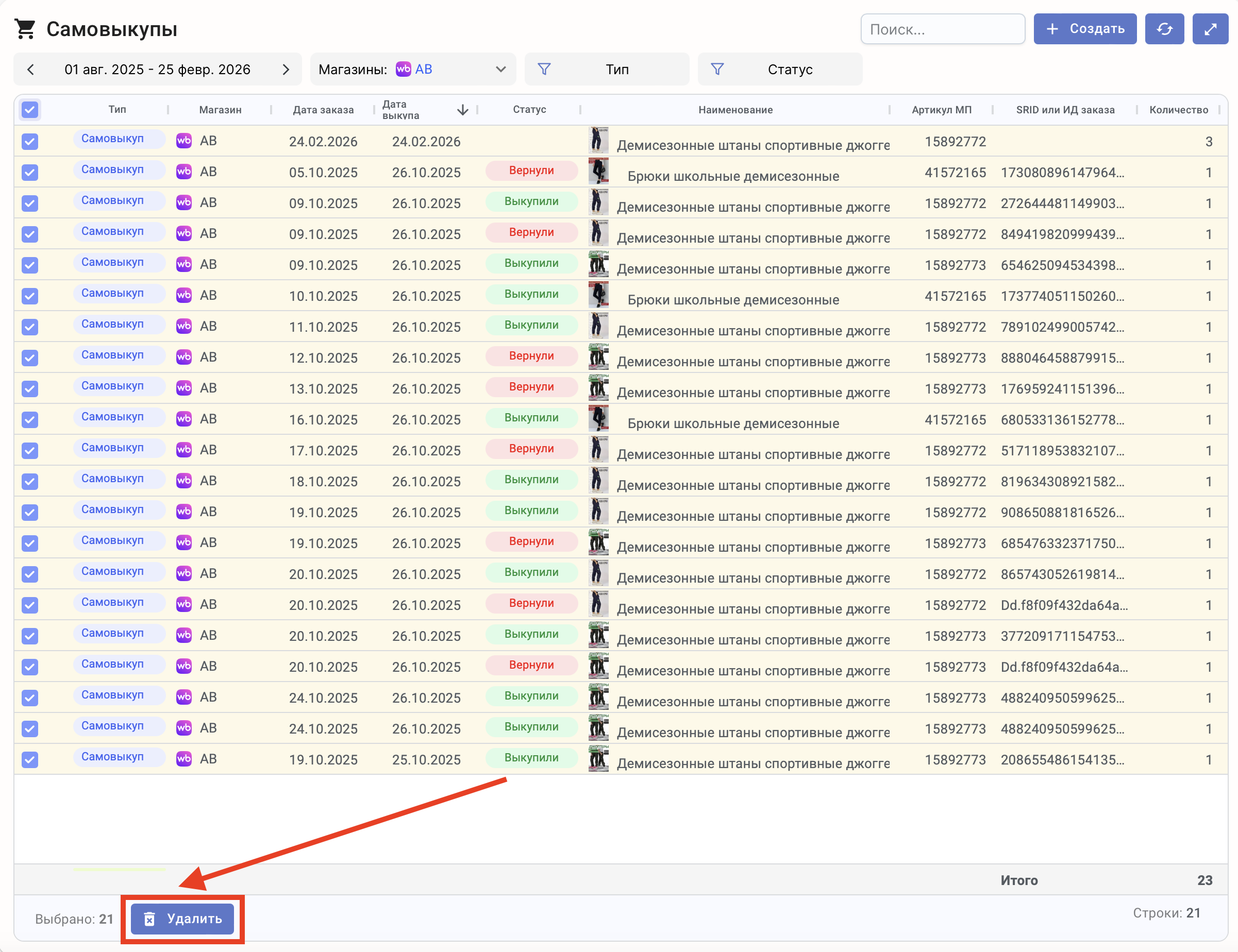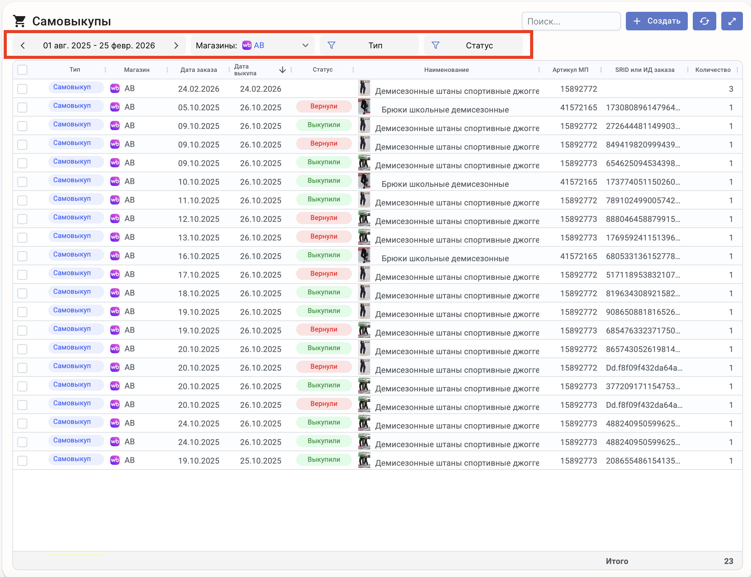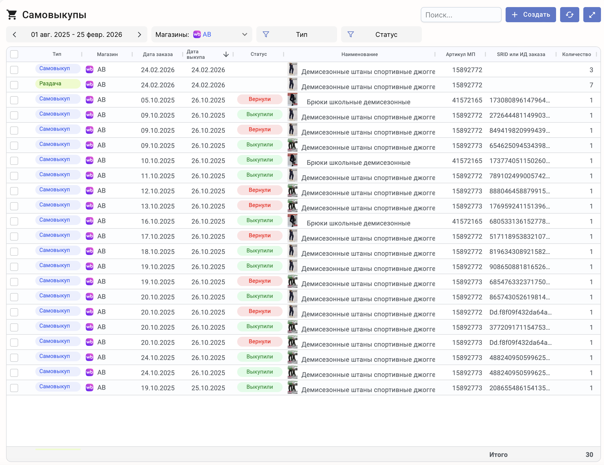 Сервис также отслеживает статус самовыкупов. Если товар был выкуплен, а затем возвращен (например, подрядчик сдал товар обратно), сервис это увидит. Это полезно для контроля работы подрядчиков по самовыкупам.