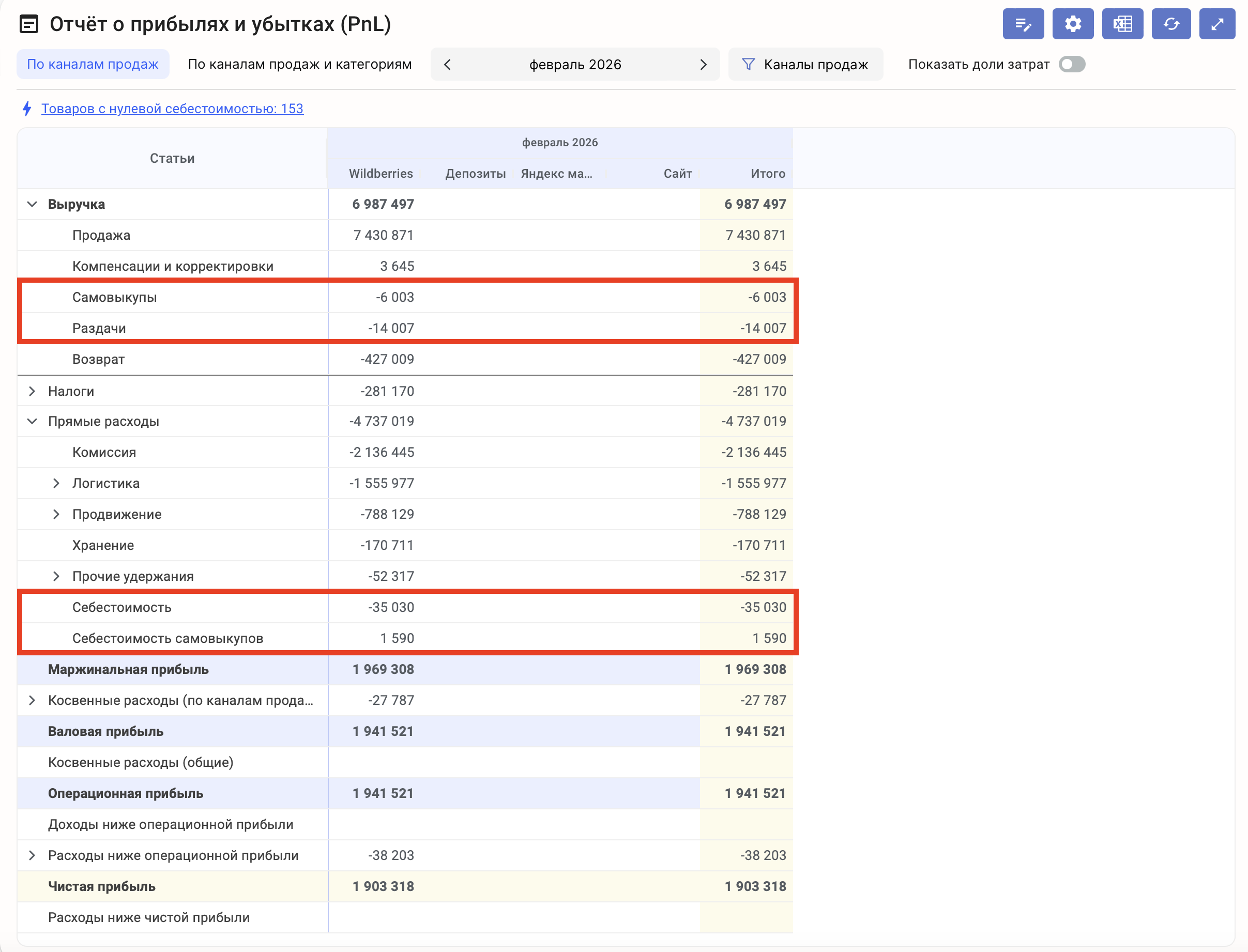 В этом случае затраты на самовыкупы уменьшают итоговую прибыль, показывая реальный финансовый результат с учетом маркетинговых вложений в выкупы.