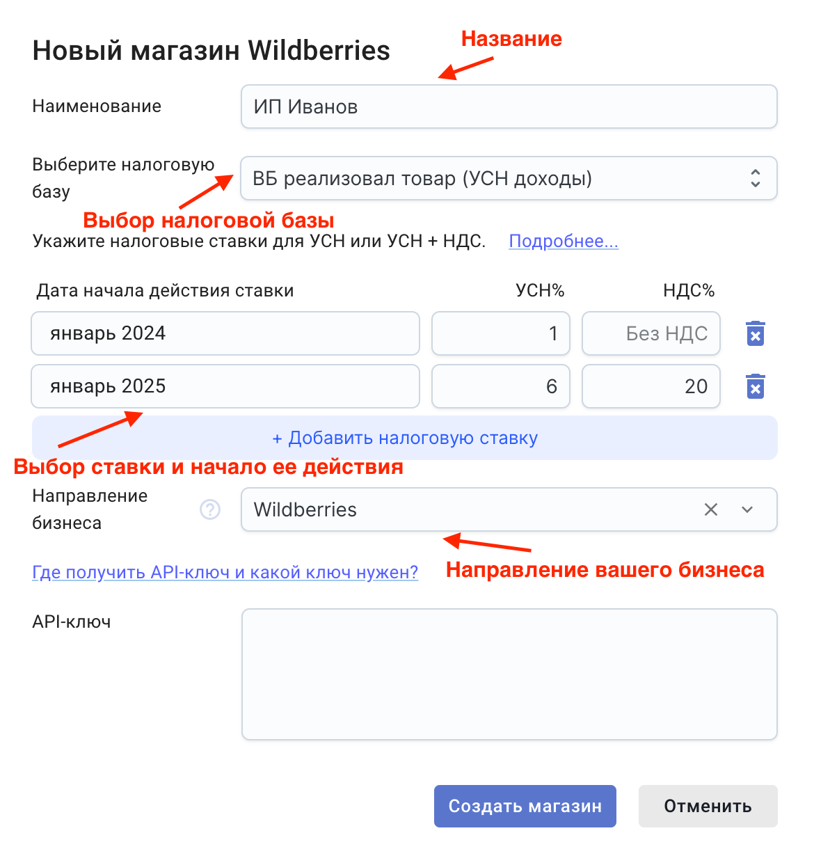 В открывшемся окне заполните данные по магазину. Введите наименование , выберите налоговую базу. В сервисе есть два варианта: