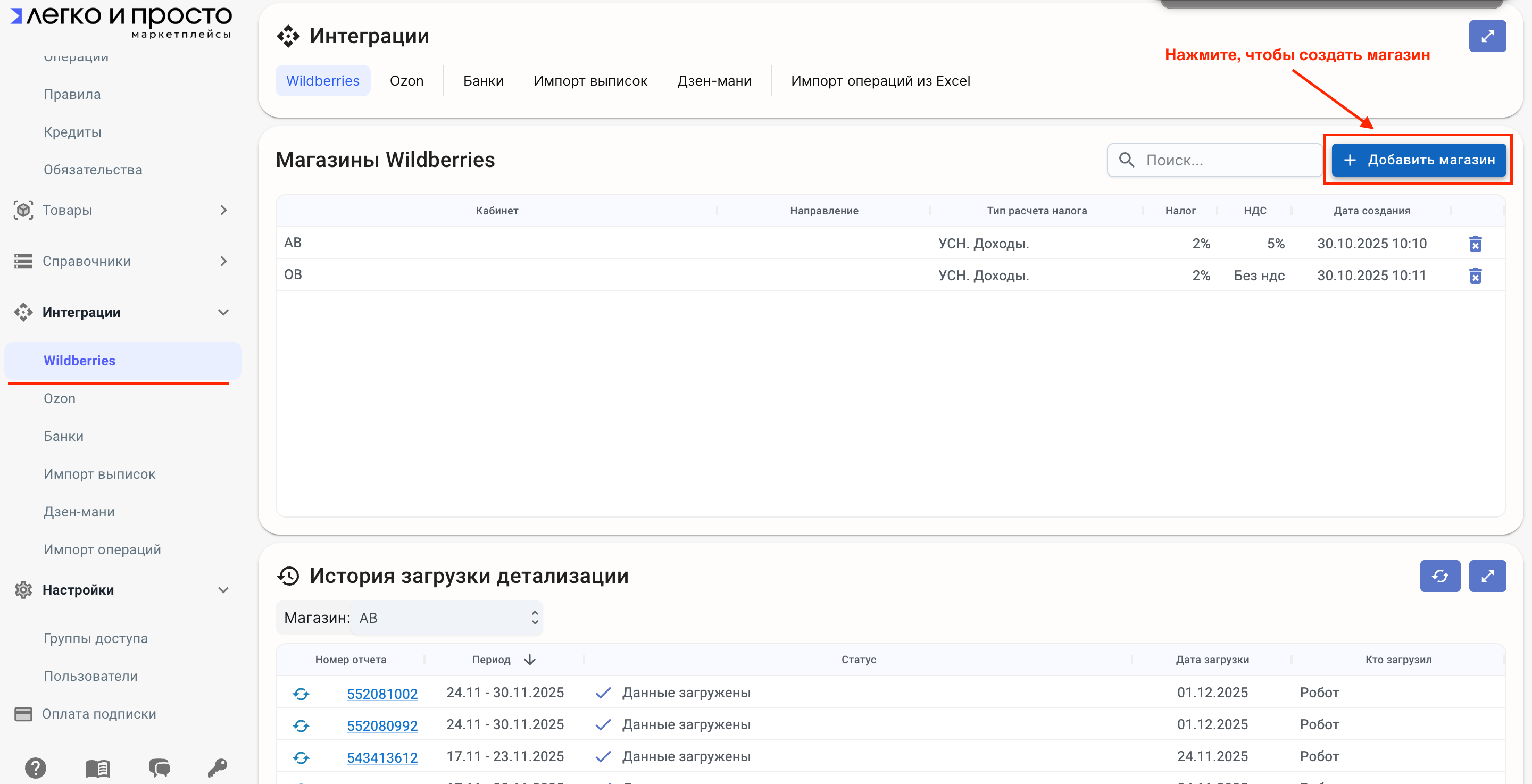 Перейдите в раздел: Интеграции → Wildberries Нажмите кнопку Добавить магазин.