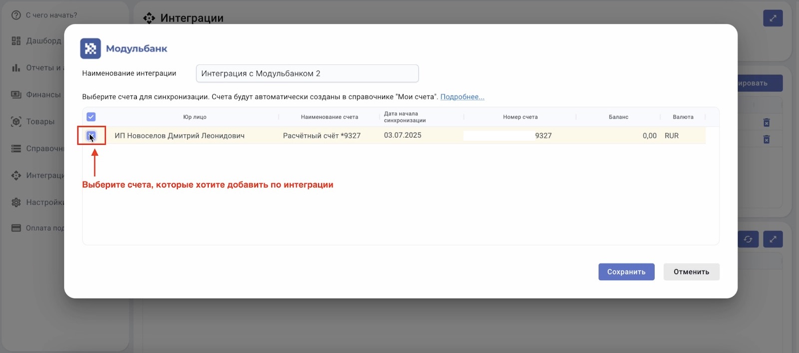 После возвращения в сервис "Легко и просто" выберите счет или счета, по которым хотите настроить интеграцию.