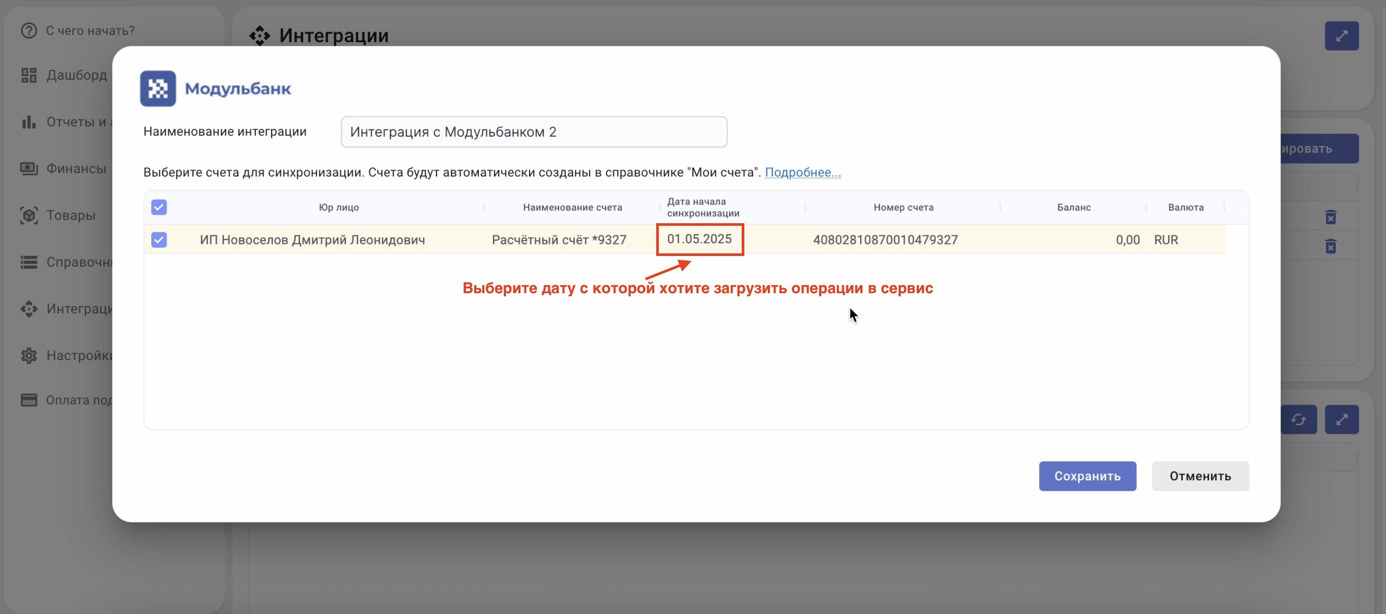 Укажите дату начала синхронизации, с которой нужно загрузить данные.