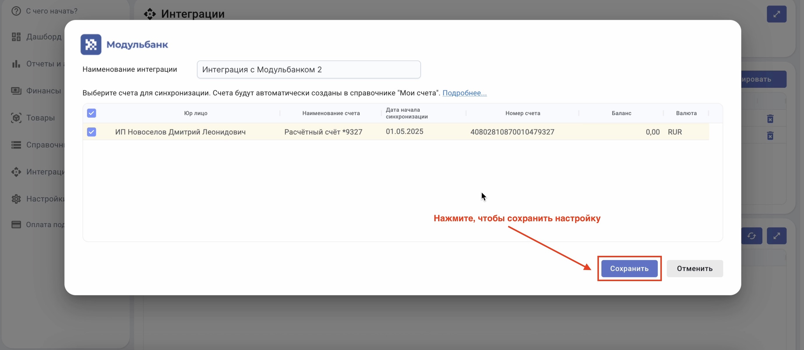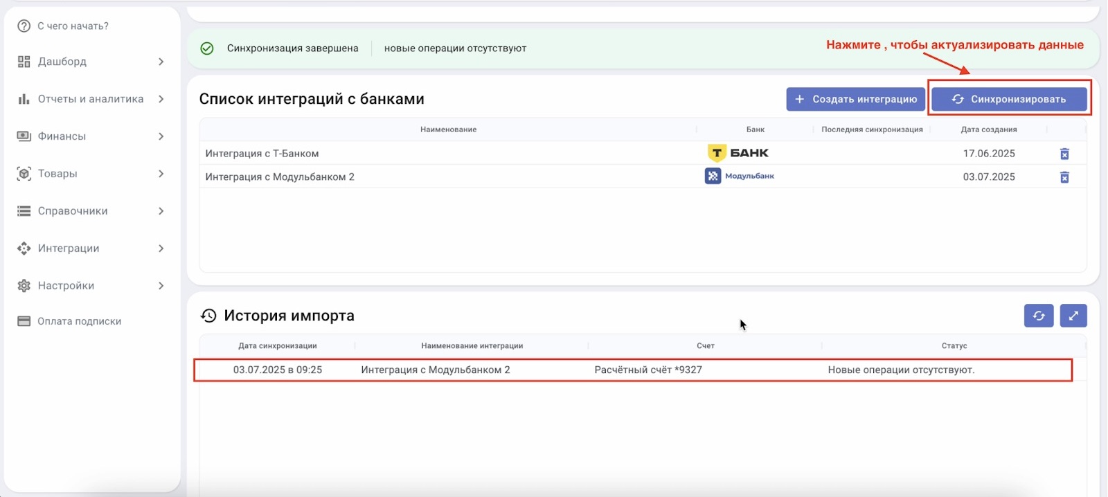 Готово! Интеграция с Модульбанком успешно настроена. Операции загружаются в сервис автоматически.