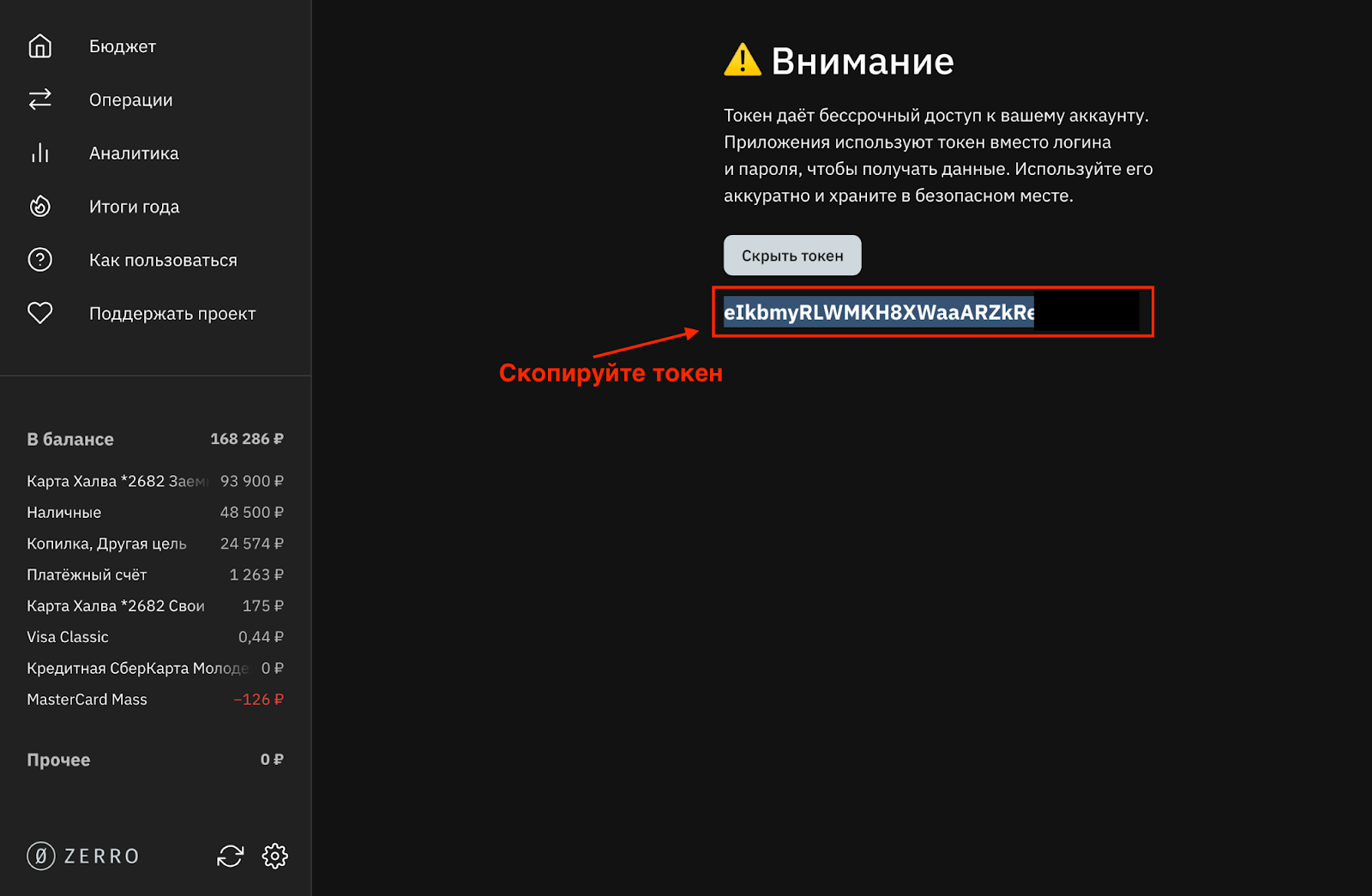2. Скопируйте токен и вставьте его в API-ключ Дзен-мани в сервисе "Легко и просто"