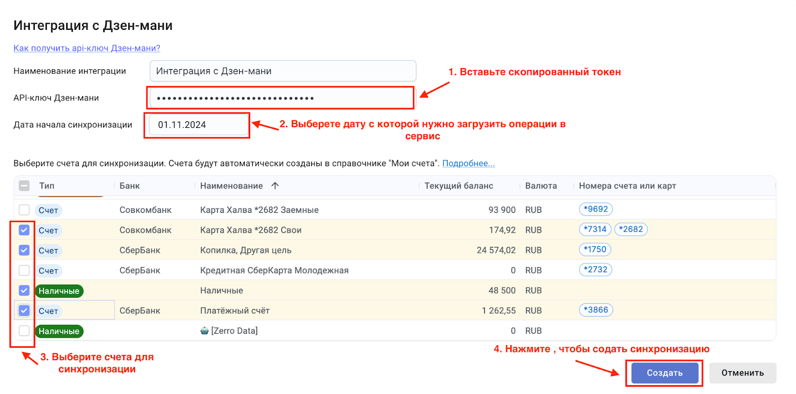 Вставьте скопированный токен в поле API-ключ Дзен-мани.