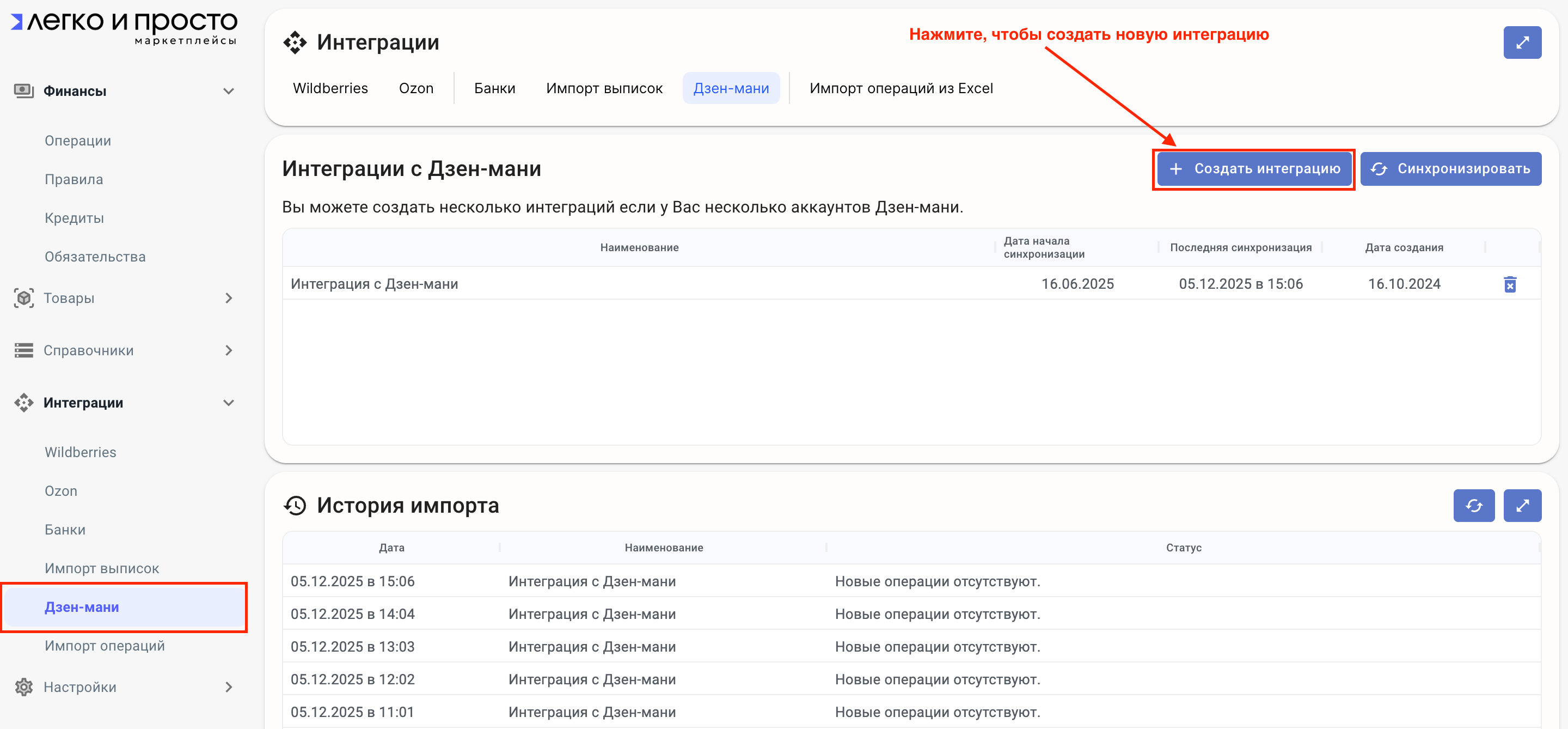 Перейдите в сервис "Легко и просто" → Интеграции → Дзен-мани.