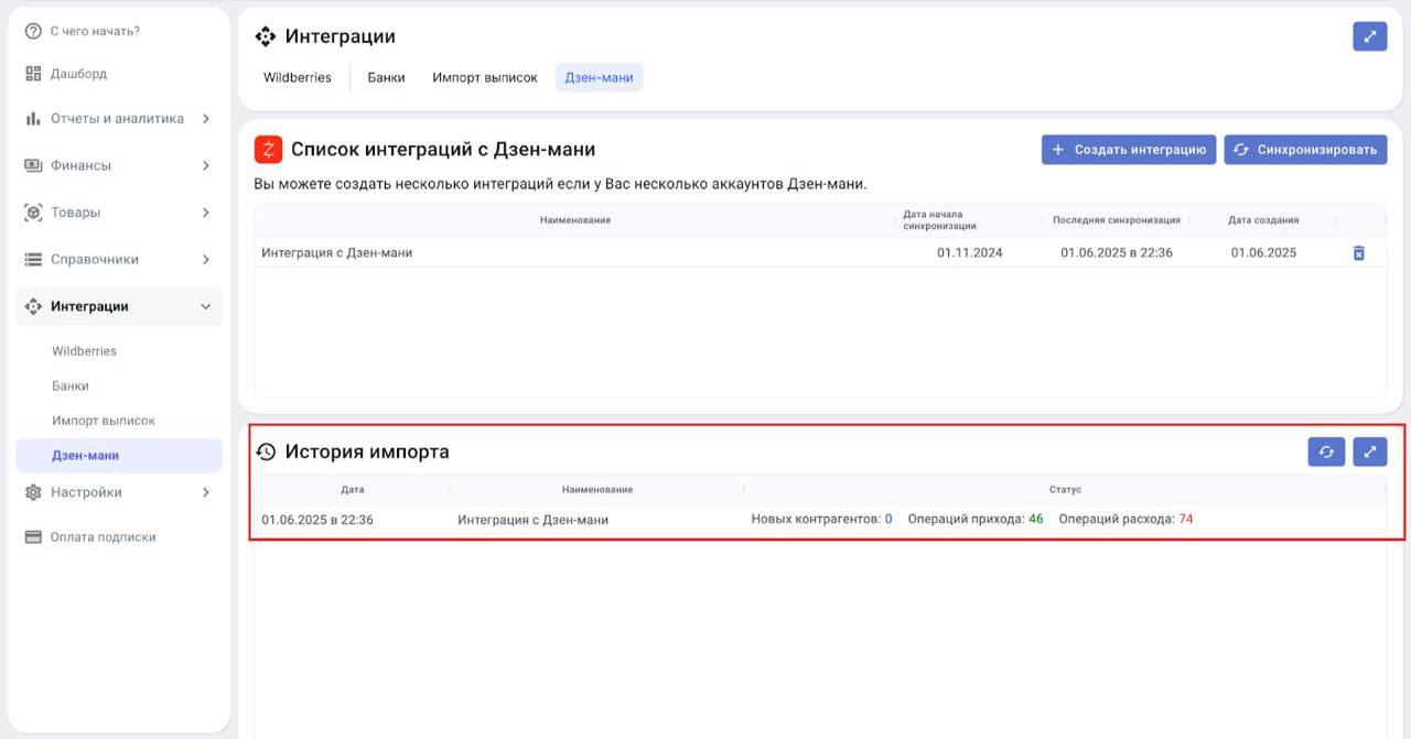 Информация отобразится в разделе История импорта, где можно посмотреть: