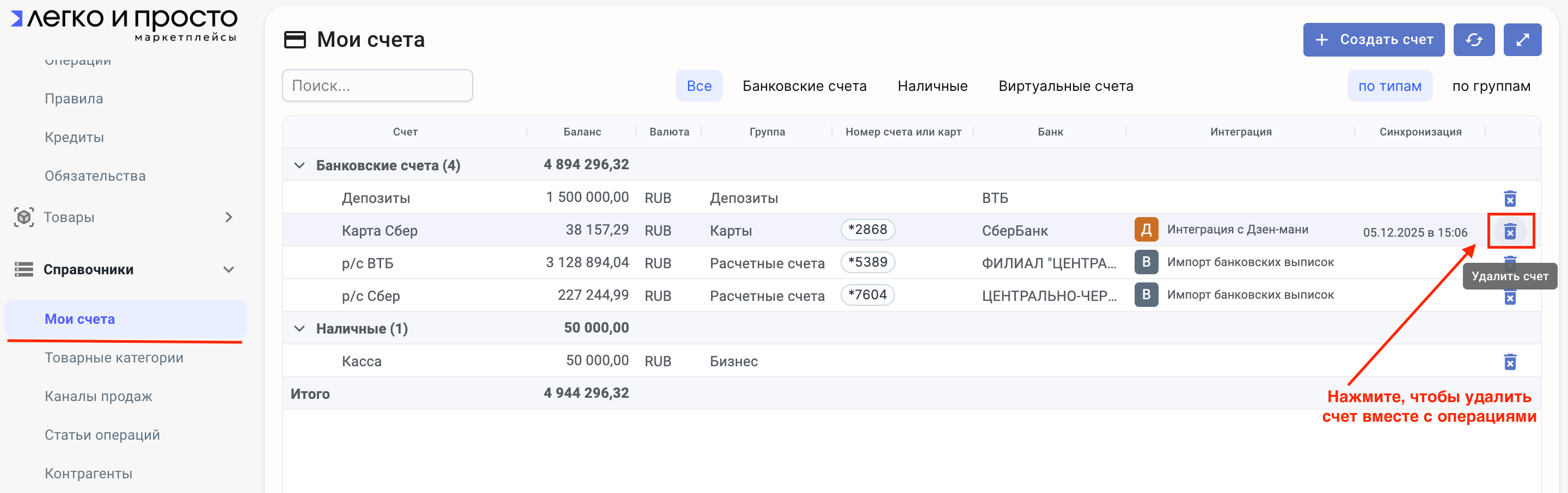Чтобы удалить все операции по счету, перейдите в Справочники → Мои счета.