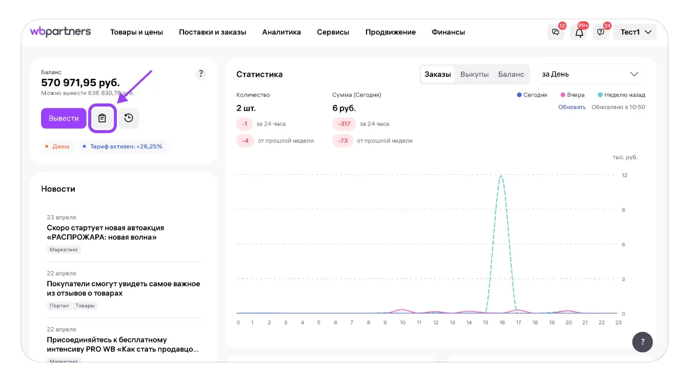 Также на главной странице нажмите на кнопку Финансовые отчёты рядом с балансом.
