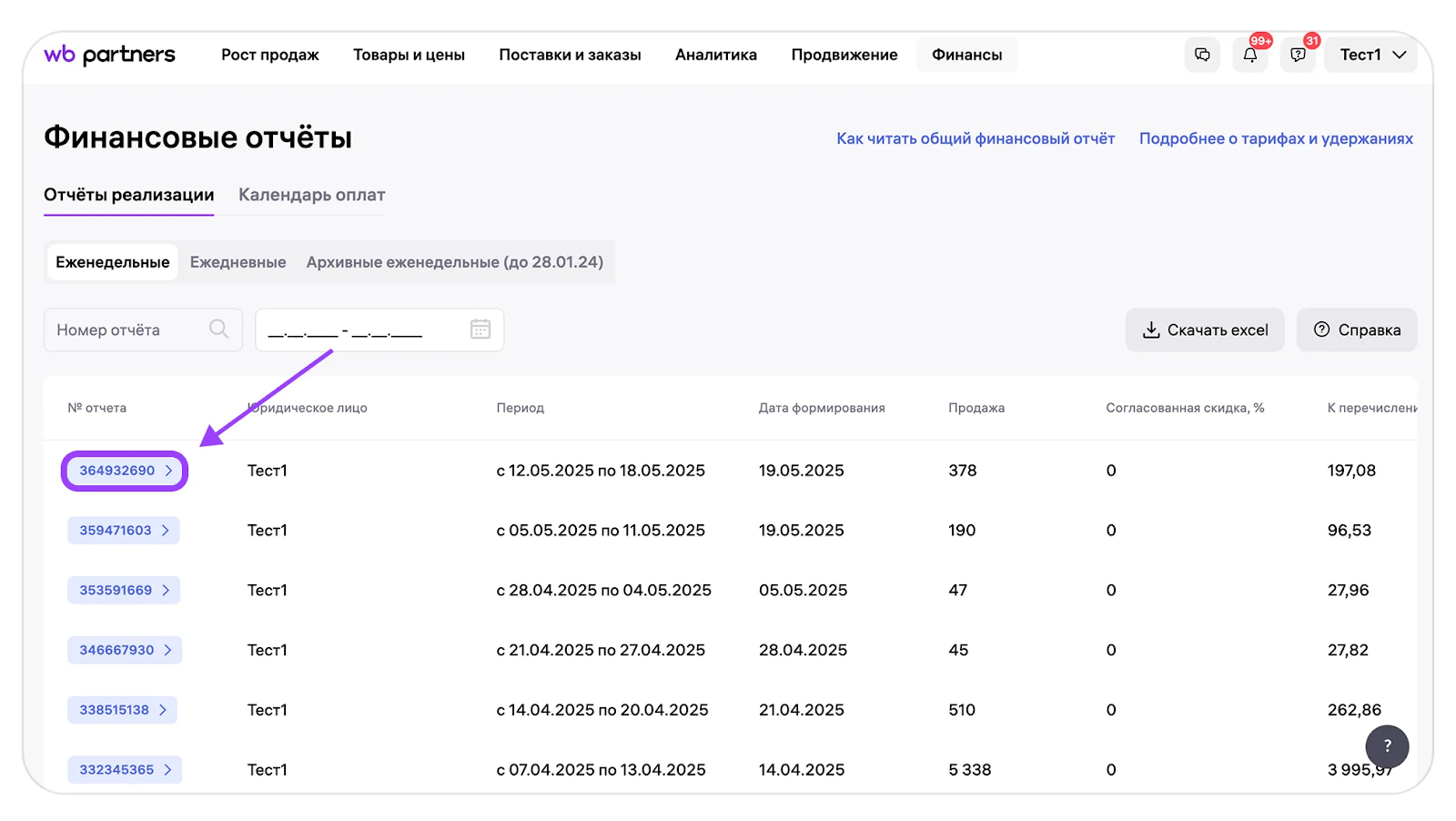 Нажмите на номер отчета, чтобы загрузить соответствующую детализацию.
