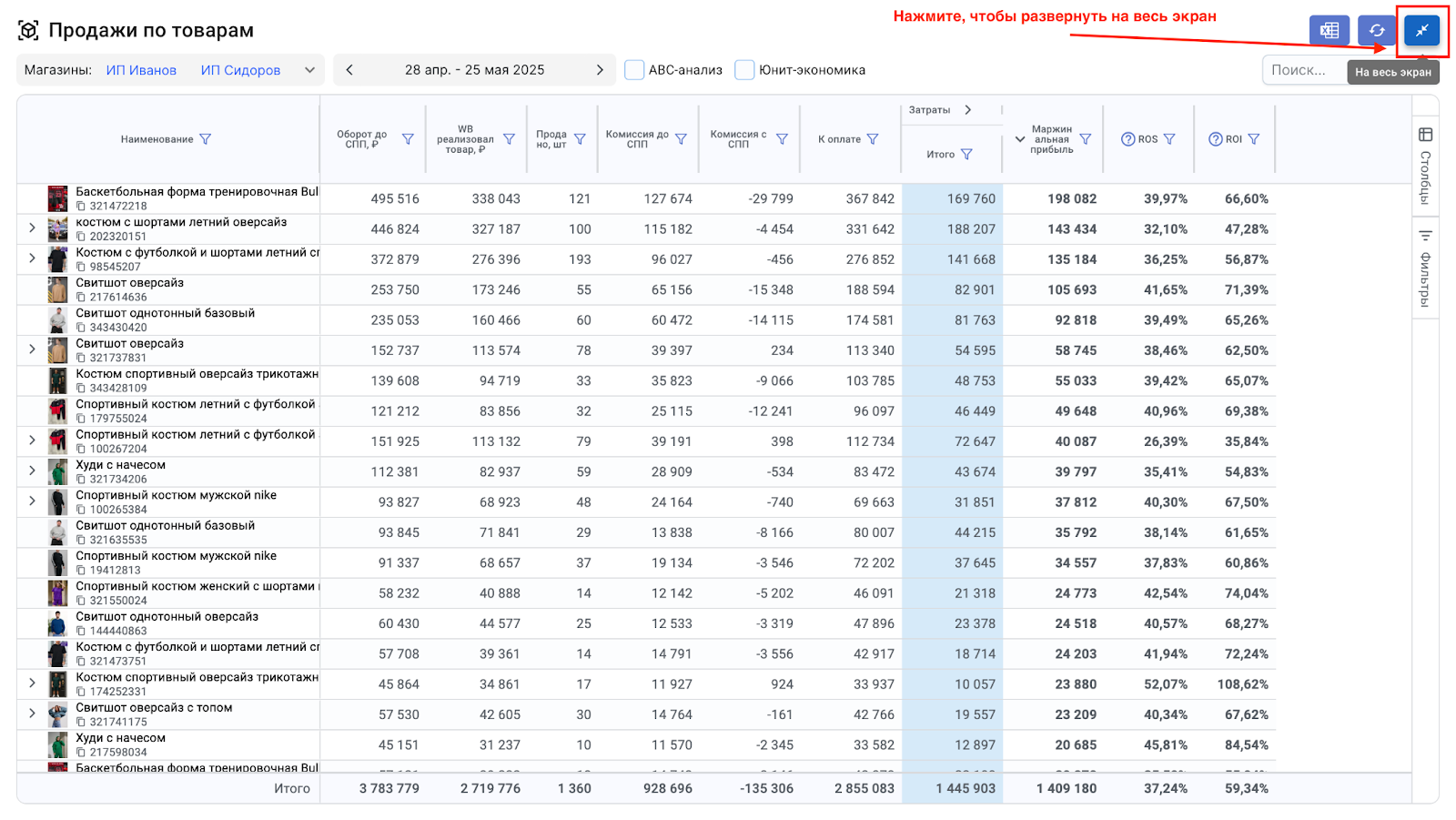 Любую вкладку сервиса можно развернуть, нажав на иконку разворота в правом верхнем углу экрана.