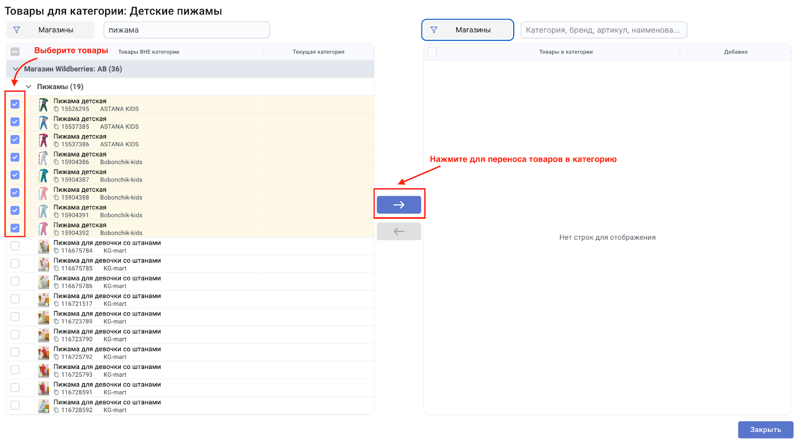Высветится таблица со всеми доступными товарами в левой части, выделите те, которые хотите отнести к данной категории и нажмите на стрелочку , чтобы перенести товары в категорию , перенесенные товары отобразятся уже в правой части таблицы.