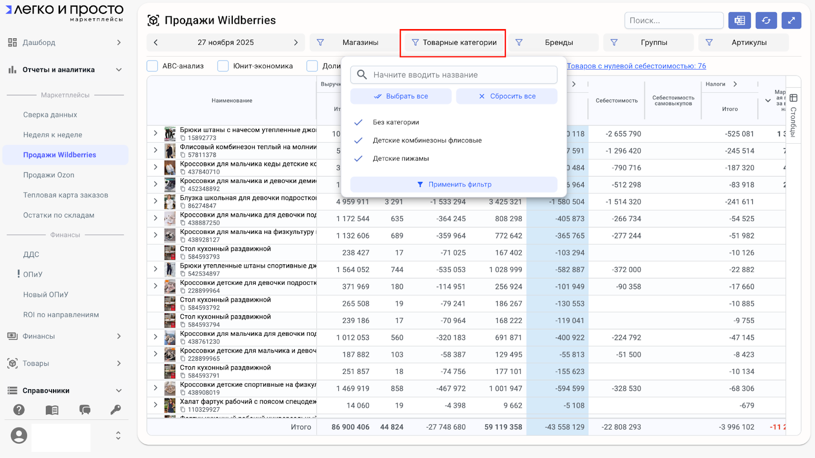 В сервисе «Легко и Просто» пользователь может создавать собственные товарные категории и наполнять их нужными артикулами. Это позволяет не привязываться к брендам или системным группам и гибко объединять товары для анализа их прибыльности.