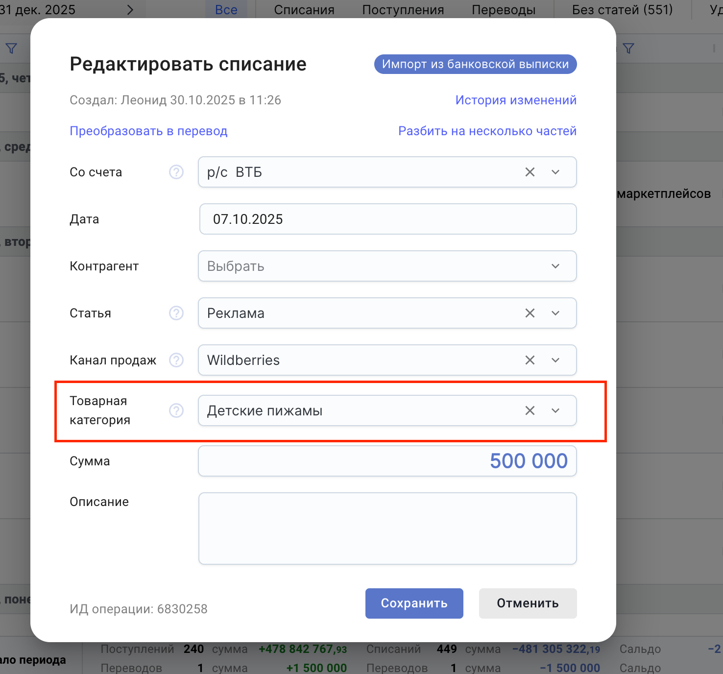 После создания категорий, их необходимо использовать при проведении финансовых операций. Выберите соответствующую Товарную категорию, к которой относится эта операция (например, если оплачивается внешняя реклама товара, выберите категорию, к которой относятся рекламируемые артикулы).