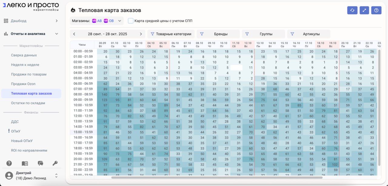 Также распределение по товарным категориям можно увидеть в Тепловой карте заказов.