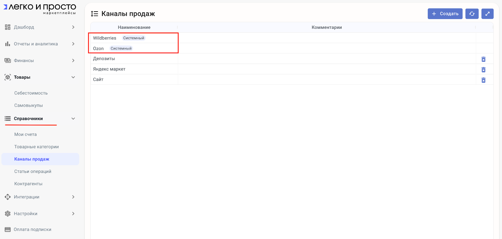 Так как сервис "Легко и просто" напрямую связан с маркетплейсами , при регистрации в аккаунте автоматически появляются два системных канала продаж Ozon и Wildberries.