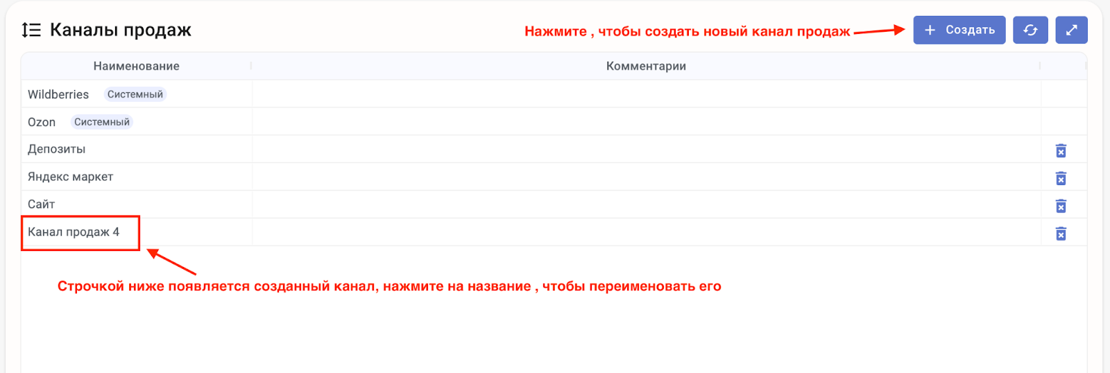 Если у вас есть другие каналы продаж, например маркетплейсы , с которыми в сервисе нет ещё интеграции или вы продаете с собственного сайта, вы можете вручную создать канал продаж.