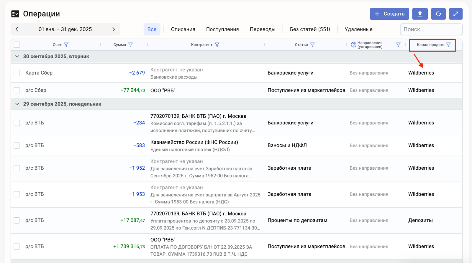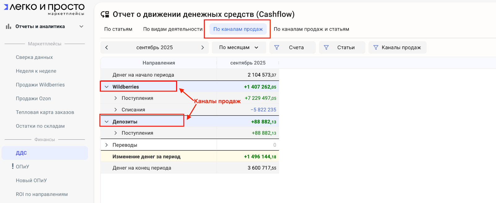 Отчет о движении денежных средств. Все операции в журнале операций можно отнести к каналу продаж, чтобы в дальнейшем можно было собрать отчет ДДС по каналам продаж.
