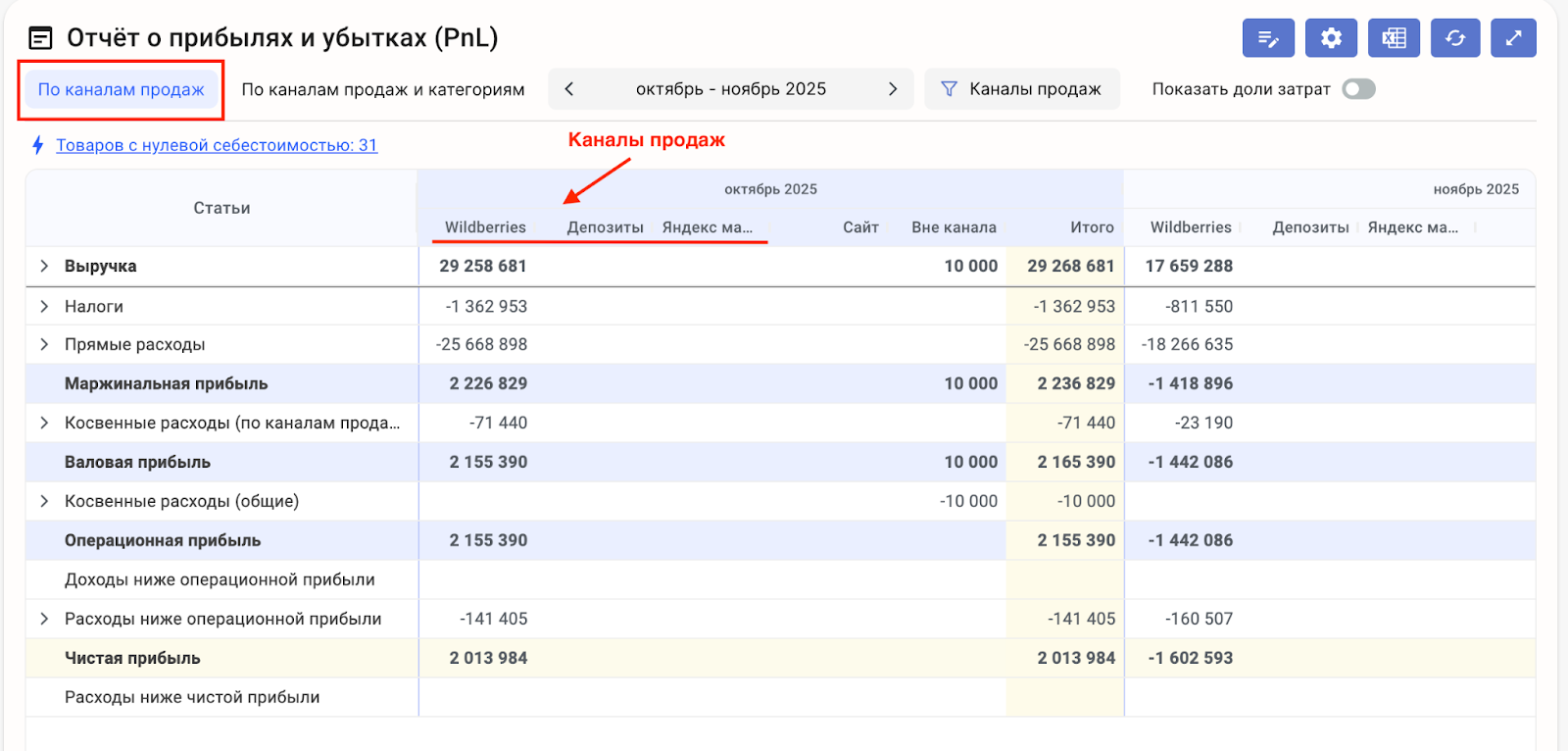 В верхней части отчета указаны названия каналов продаж , а по горизонтали расположены строки со статьями.